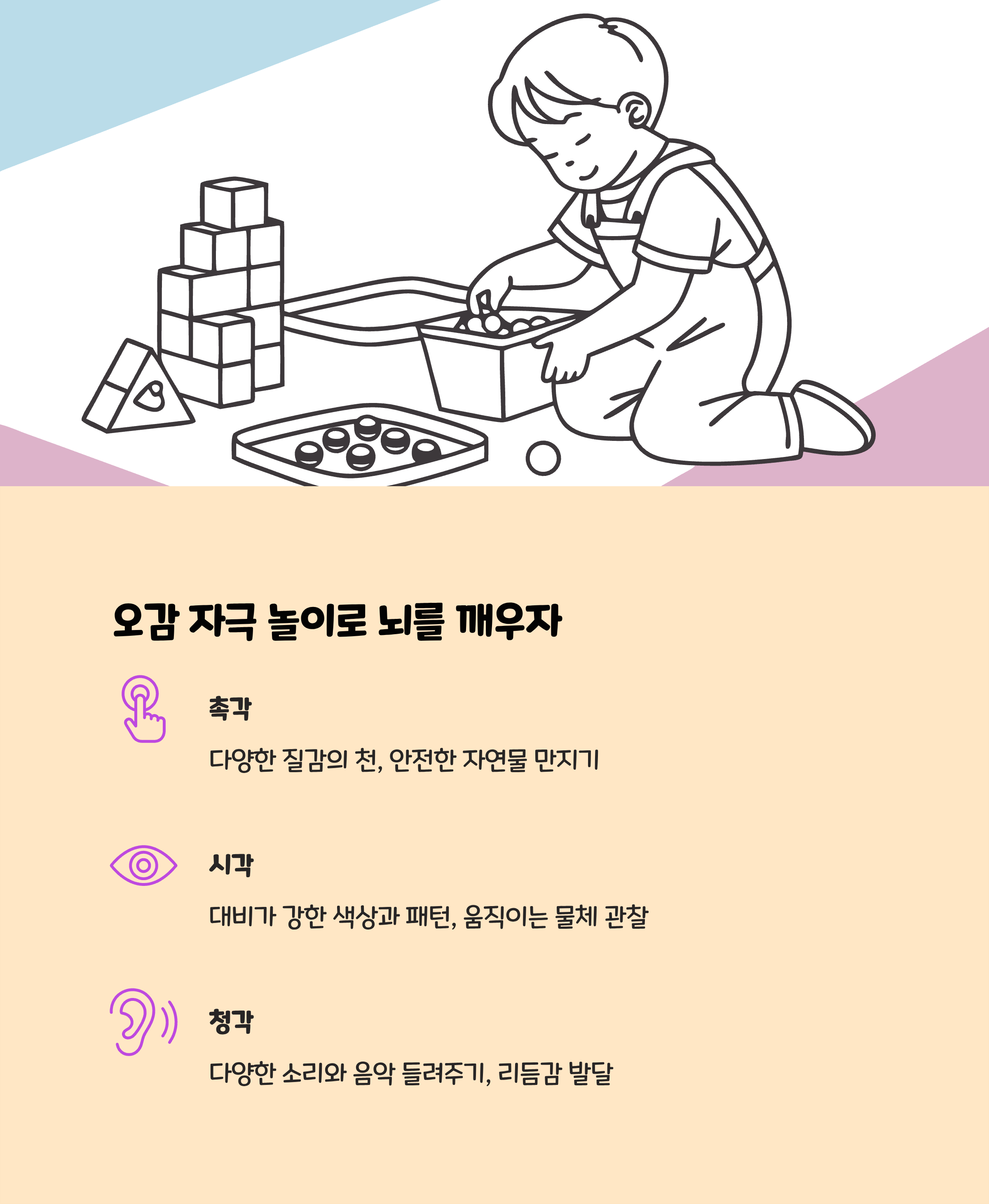 | 오감 자극 놀이 | 뇌 자극, 행동 이해력 향상 | 자연 체험, 음악 듣기, 촉감 놀이 |