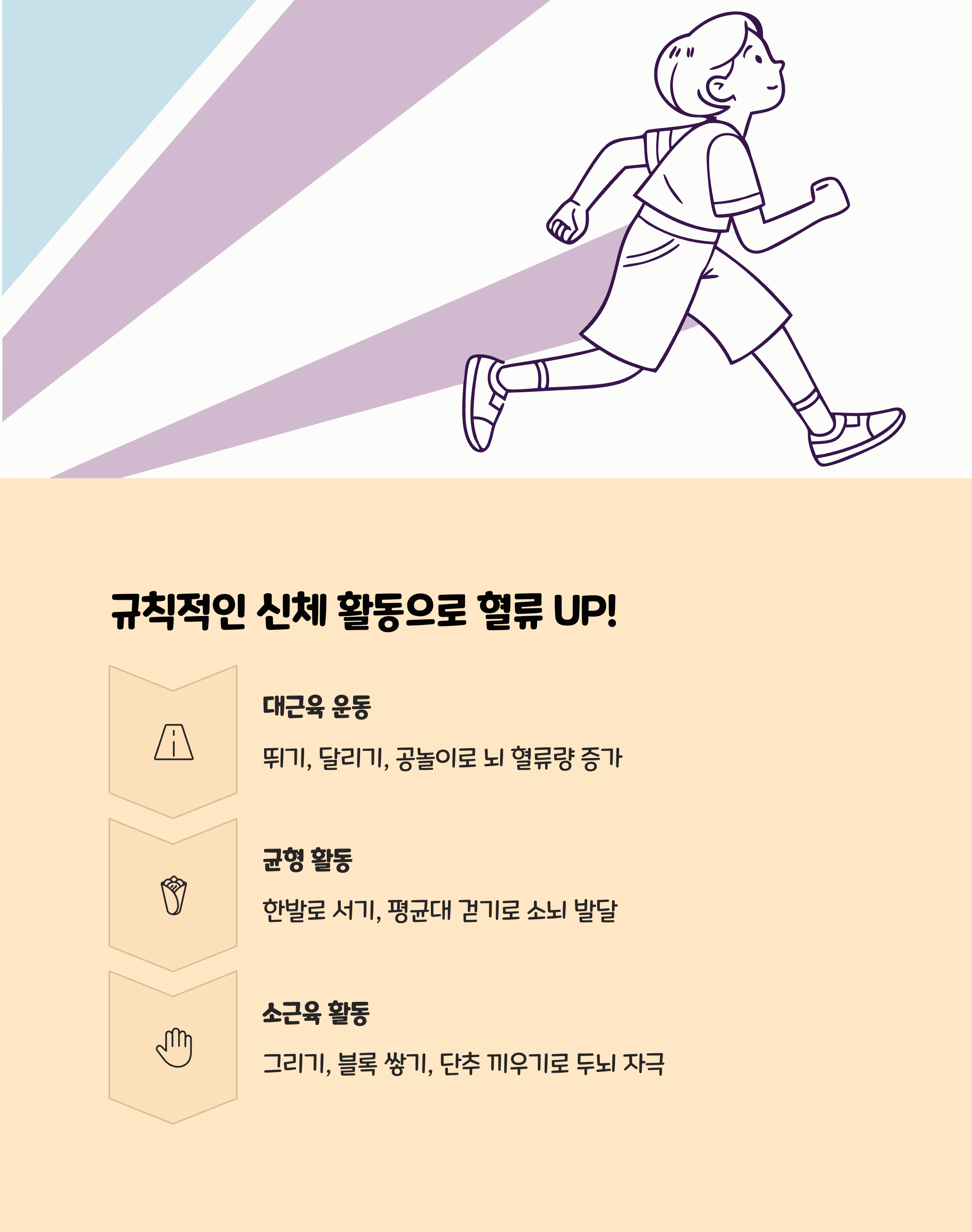 | 규칙적 신체 활동 | 혈류 증가, 균형 감각 발달 | 산책, 줄넘기, 자전거 타기, 실내 놀이 |