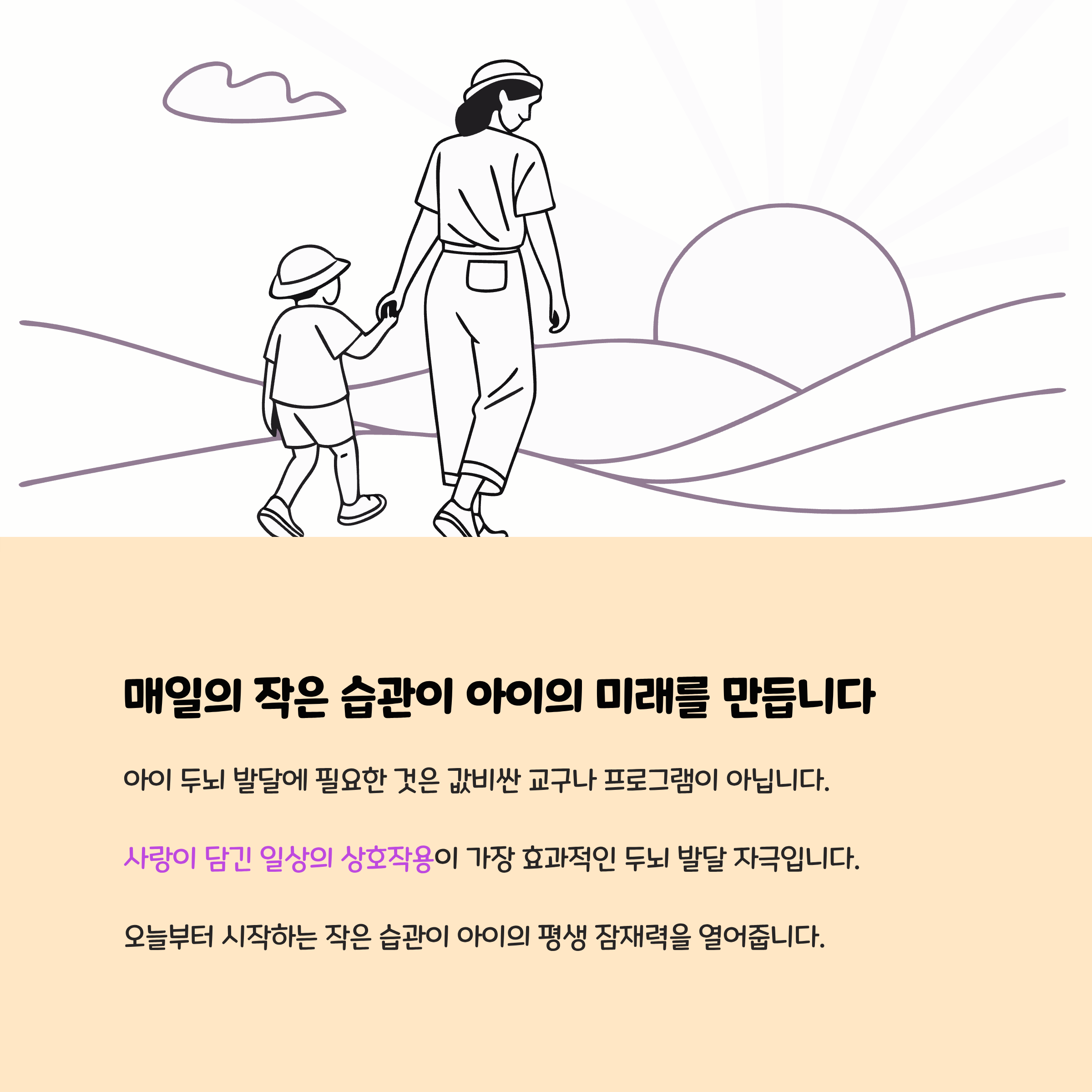 매일 꾸준히 할 수 있는 이 습관들은 아이의 두뇌 성장에 과학적으로 검증된 방법들입니다. 특히 영유아 시기는 두뇌의 기초가 다져지는 중요한 시기이므로, 부모님이 아이와의 일상 속에서 자주 접촉하고, 균형 잡힌 영양과 충분한 휴식을 취하도록 도우며, 다양한 감각과 신체 경험을 제공하는 것이 필수입니다. 너무 복잡하거나 어려운 것이 아니라, 아이와 함께 놀이처럼 즐기며 자연스럽게 습관이 되도록 해주세요.