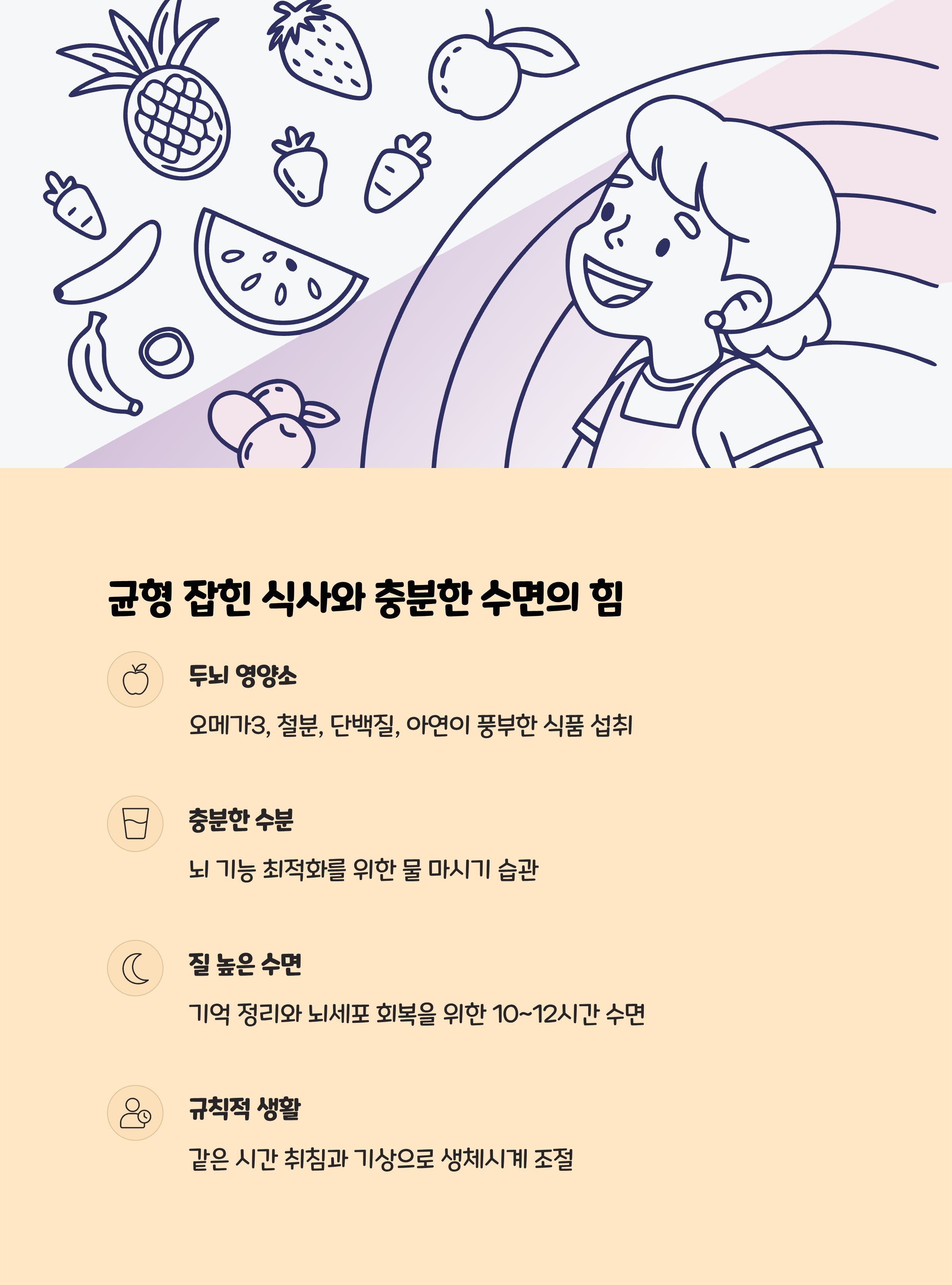 | 충분한 수면 | 기억력, 집중력, 학습력 향상 | 하루 10~12시간 수면 |