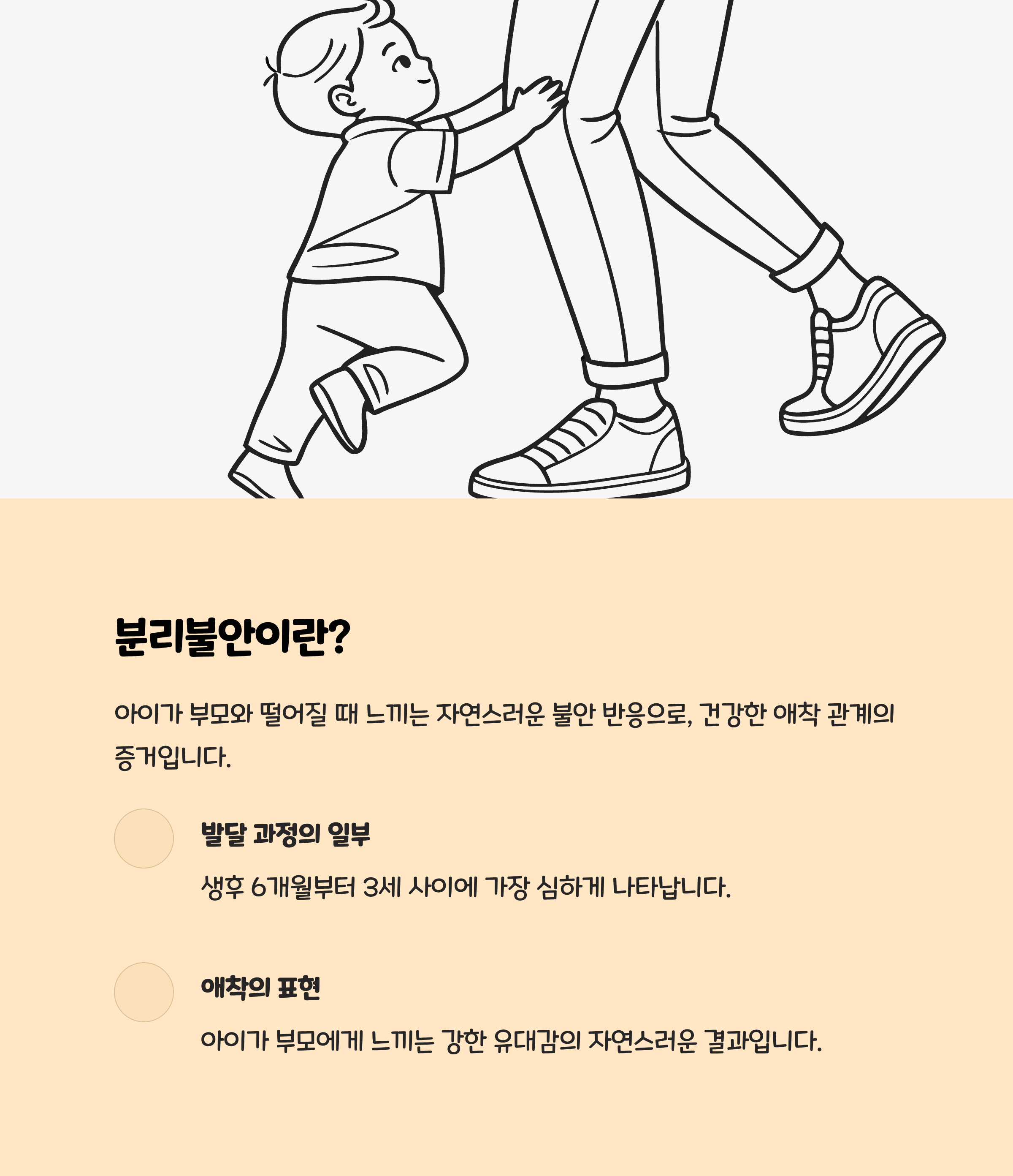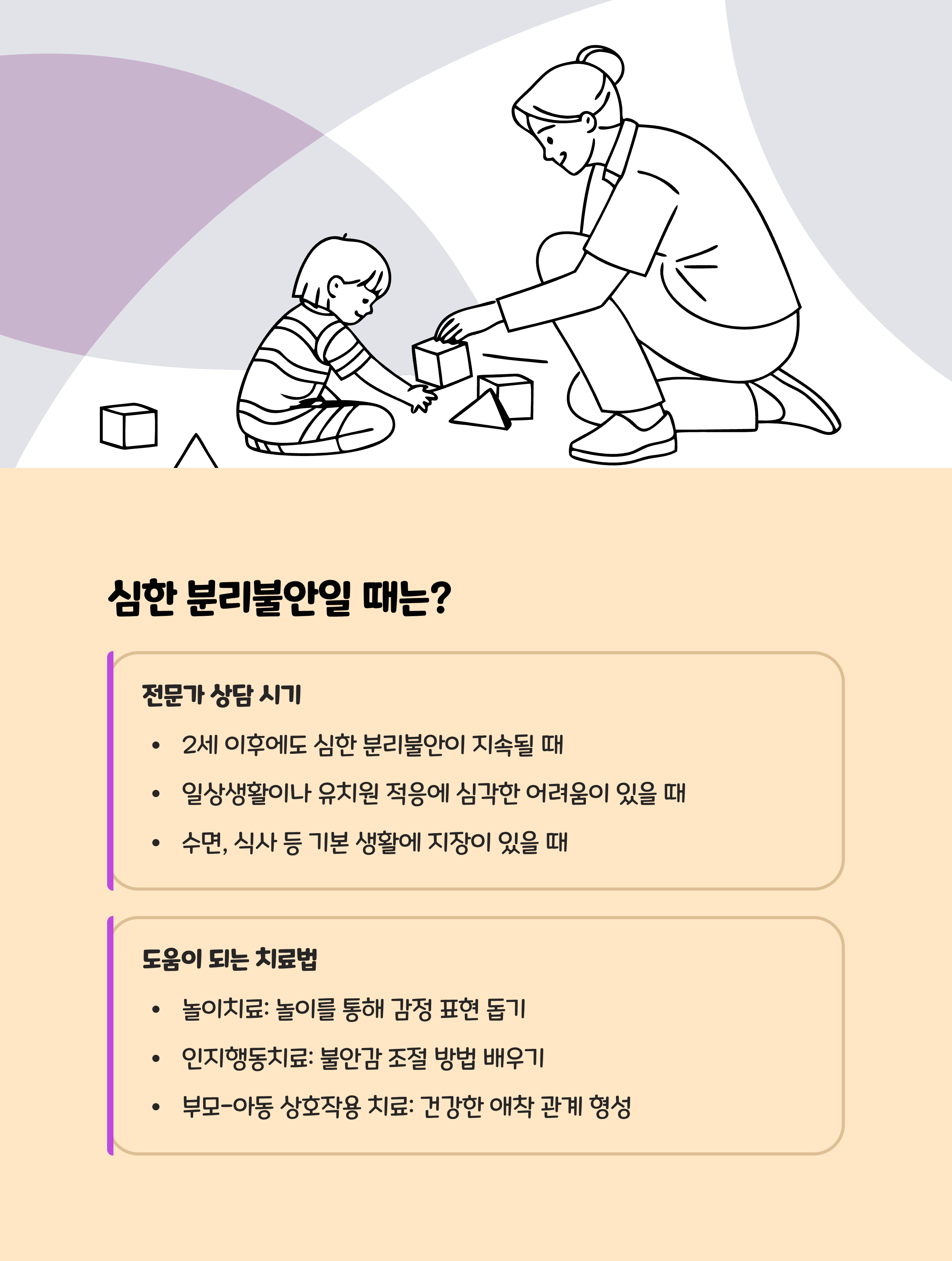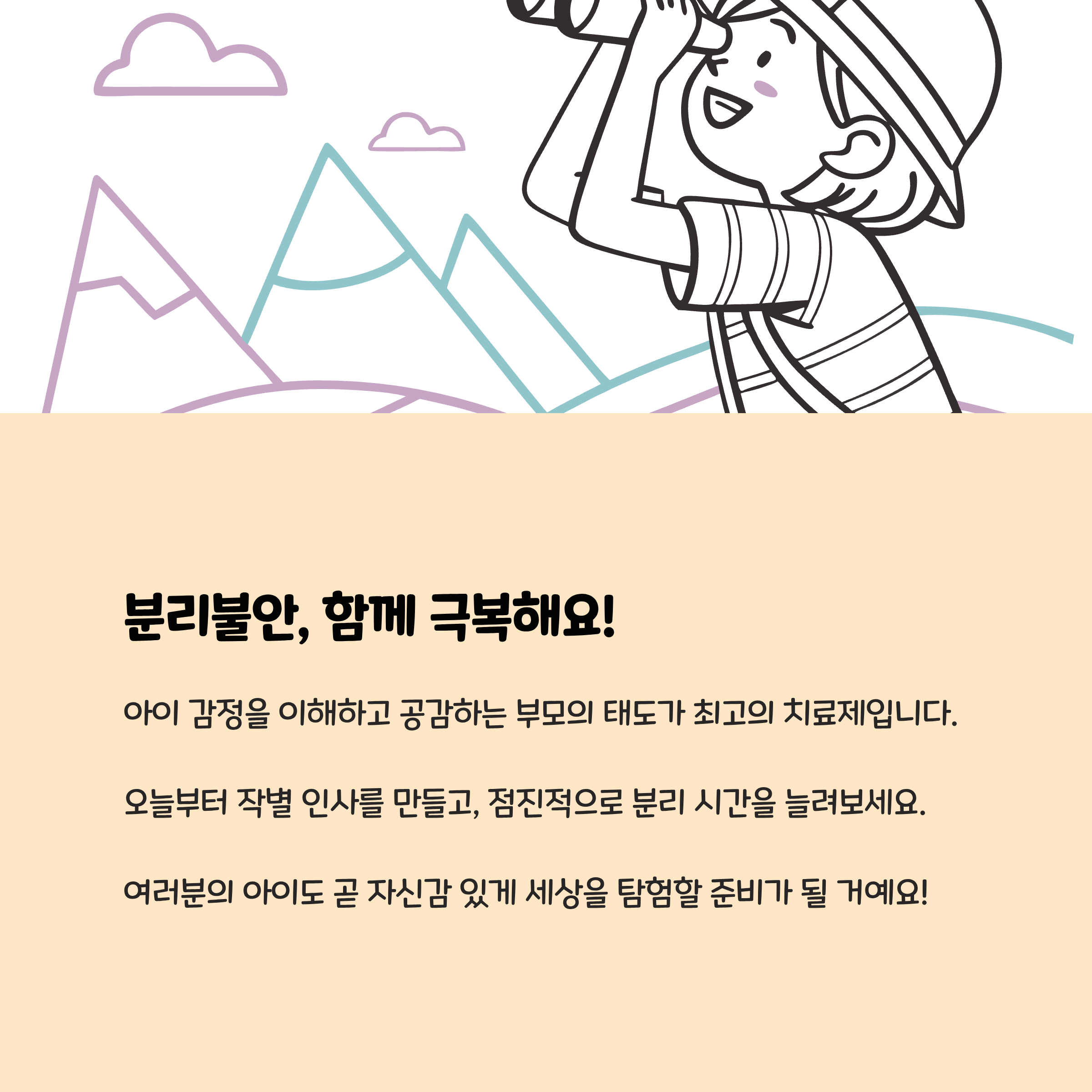 영유아의 분리불안은 부모와 떨어질 때 두려움과 불안을 느끼는 정상 발달 과정입니다. 다만, 불안이 심해 아이가 어린이집이나 유치원 등원을 거부하거나 일상생활 적응에 어려움을 겪는다면 부모의 체계적인 지원이 필요합니다.
