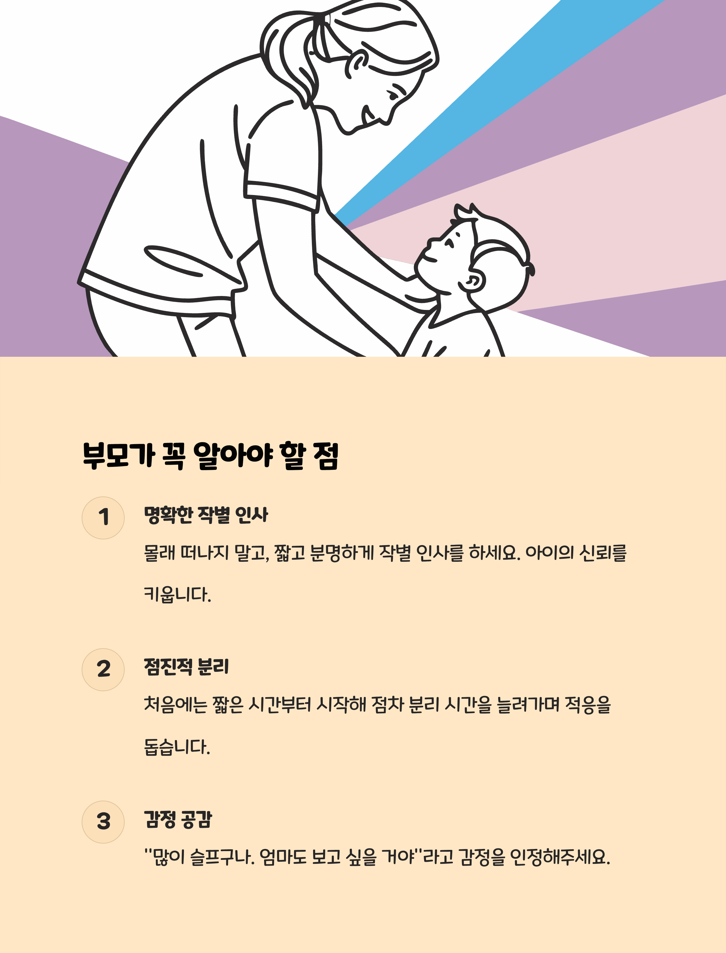 - 짧고 명확한 작별 인사 (“곧 올게”)로 아이가 예측 가능성을 느끼게 합니다.