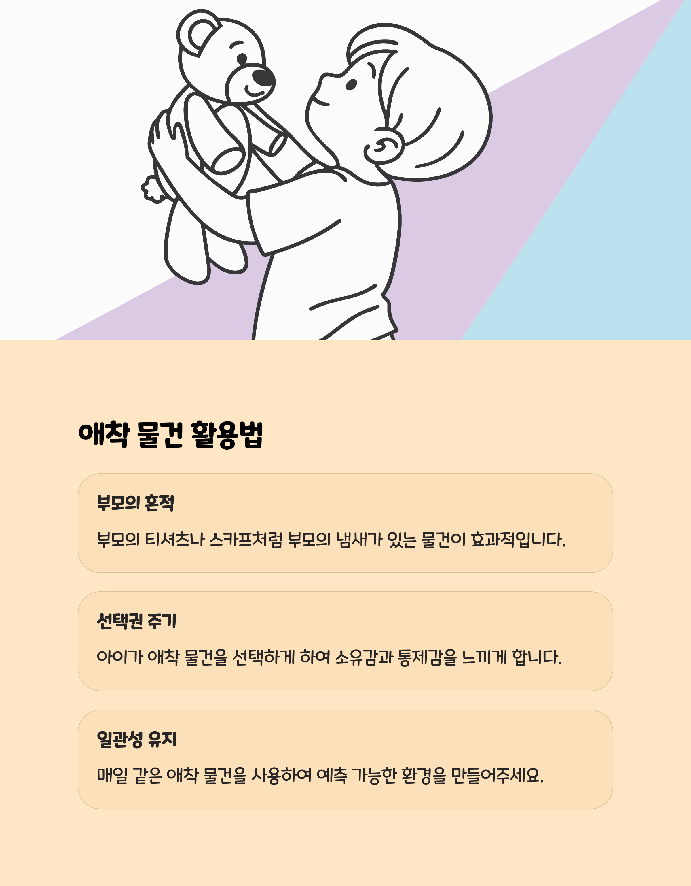 | 애착물 활용 | 인형, 담요, 사진 등 아이 안정에 도움 | 아이가 분리 시 불안을 줄이고 안심할 수 있음 |
