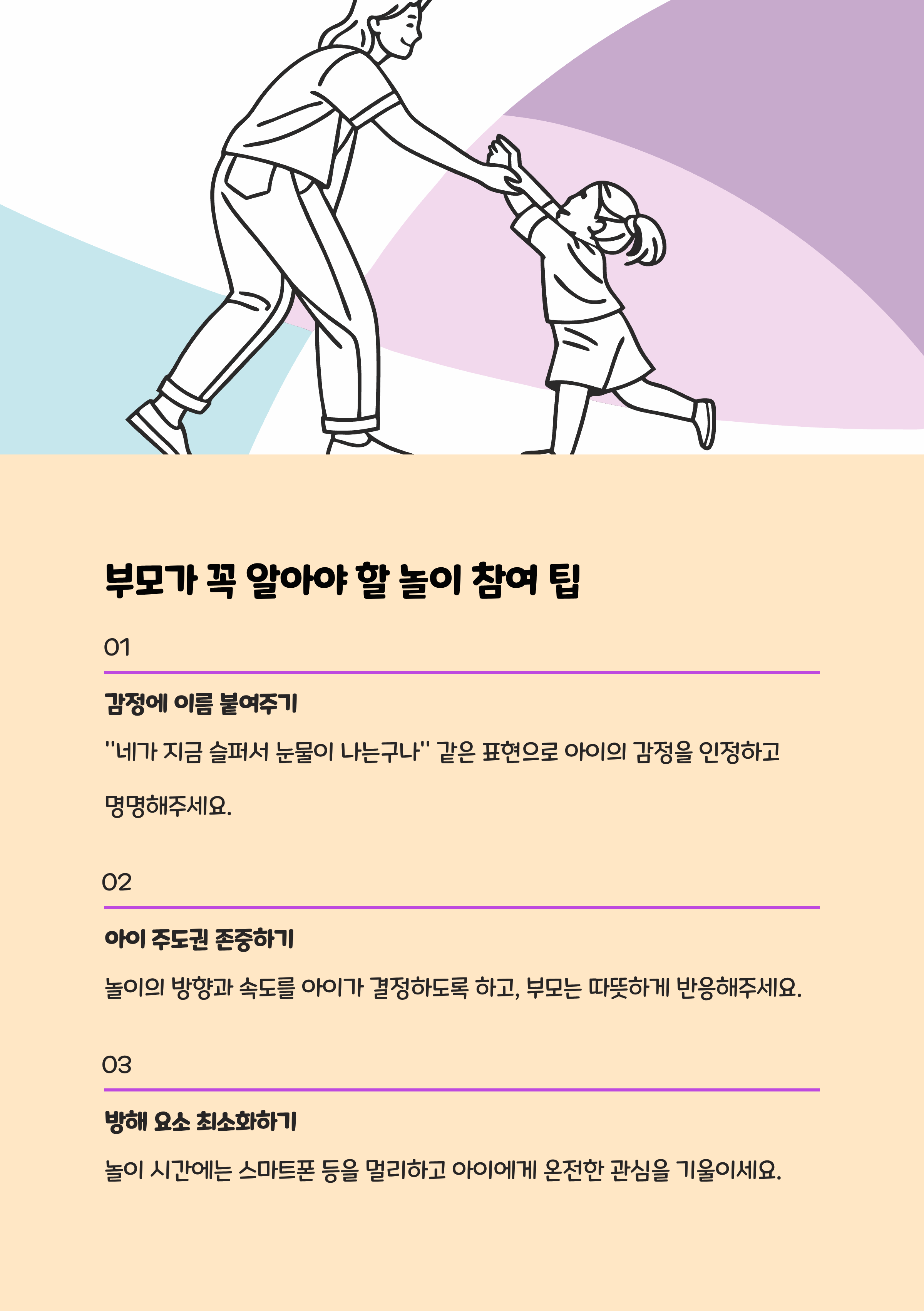 부모와의 놀이 상호작용은 아이의 정서 조절 능력과 사회성 발달에 큰 영향을 줍니다. 애착 형성과 긍정적 자아개념 형성에 도움 되며, 안전감과 신뢰감을 키워 정서 안정에 기여합니다.