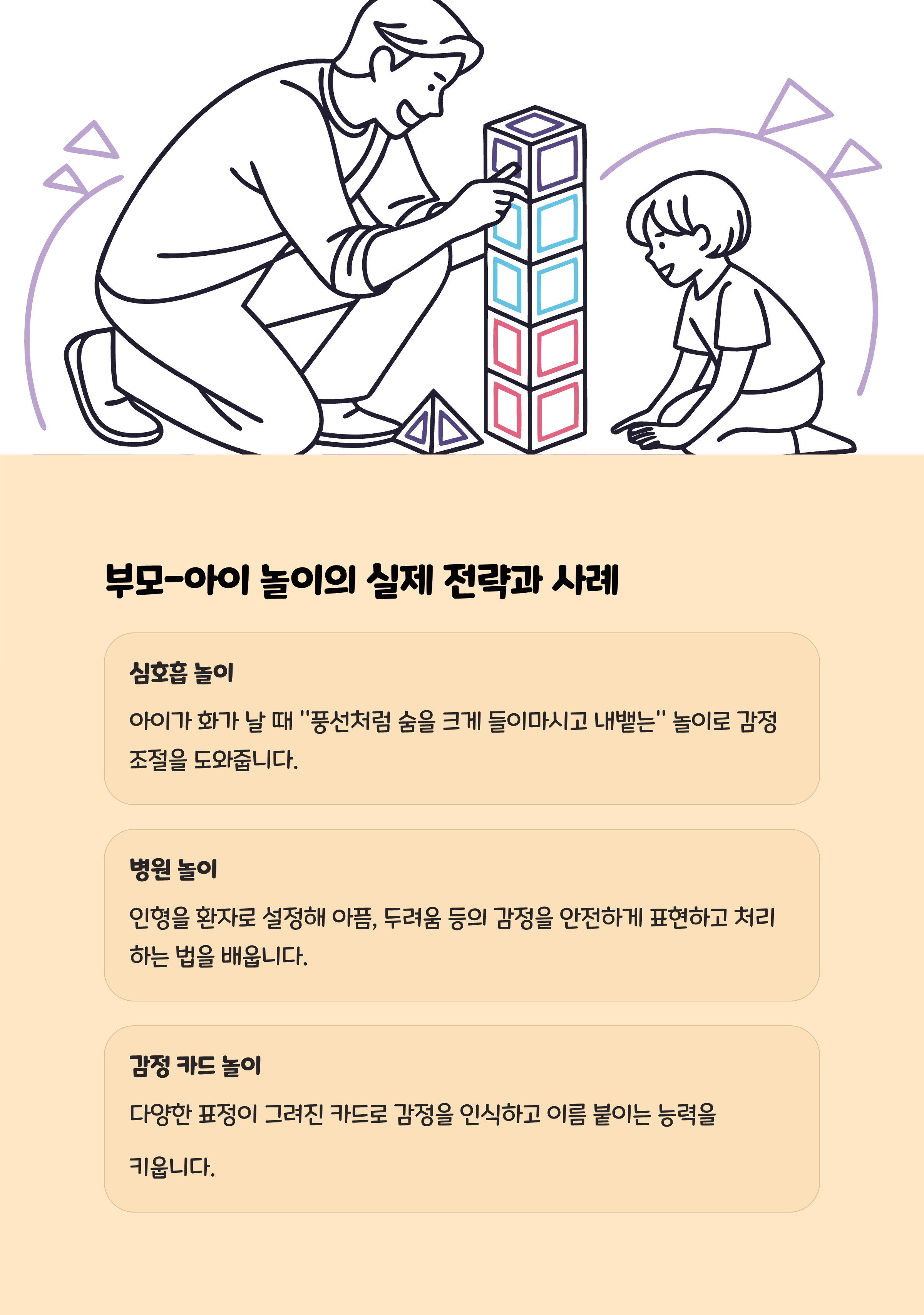 - 부모는 아이의 감정을 받아주고, 적절한 감정 단어를 알려줍니다.