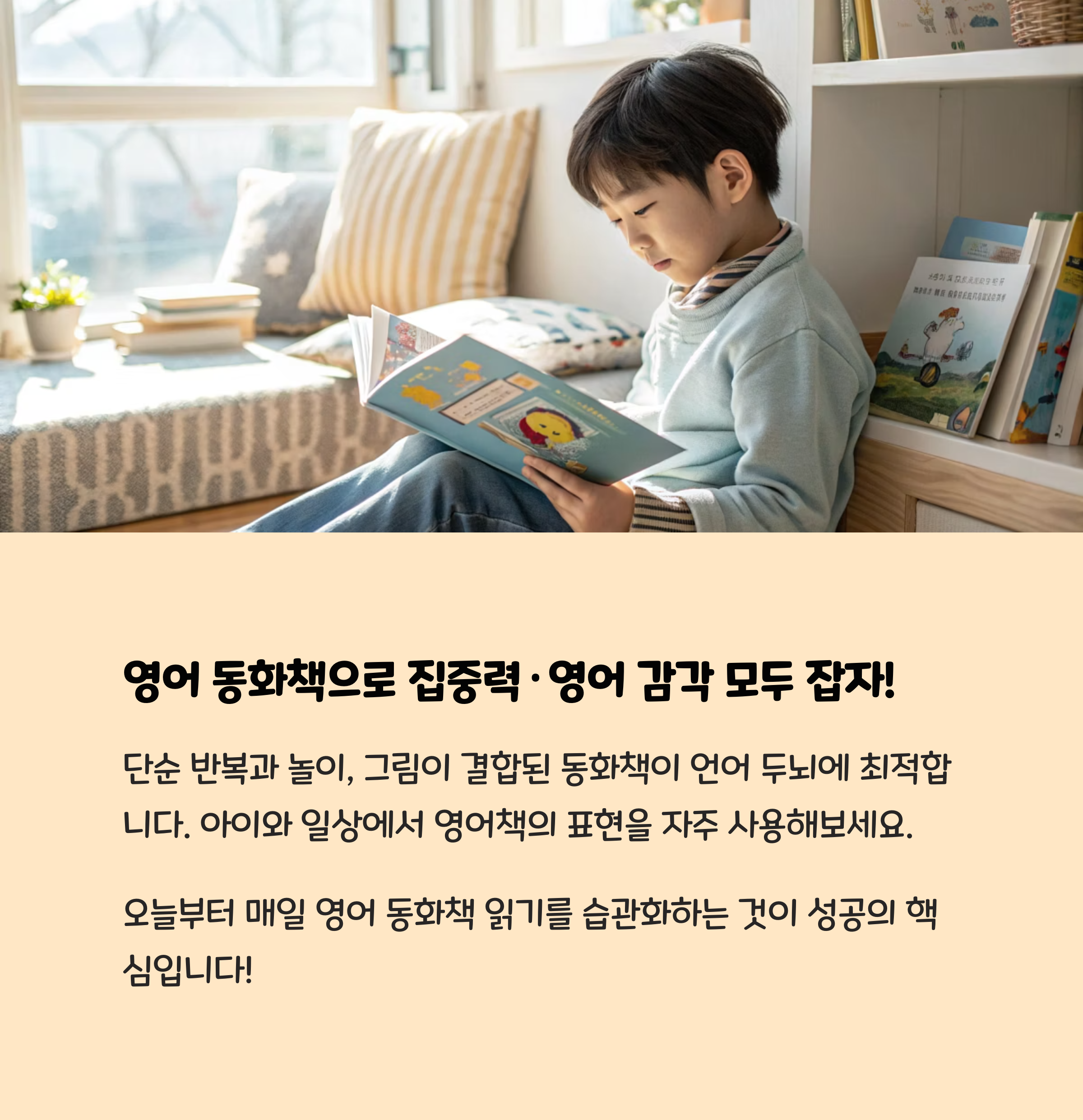 영어 동화책은 아이의 언어 습득 능력을 높여줄 뿐 아니라, 이야기 구조를 통해 논리력과 상상력, 집중력, 감정 표현 능력까지 골고루 발달시킵니다. 또한 영어에 대한 친근감을 자연스럽게 길러주고, 부모와의 유대감도 강화해 줍니다.