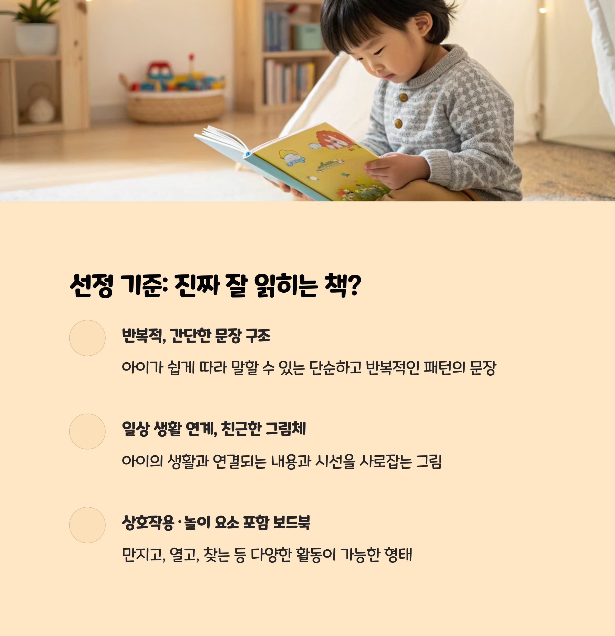 같은 책을 여러 번 반복해서 읽어주기. 반복은 아이의 언어 습득과 집중력 향상에 매우 효과적입니다.