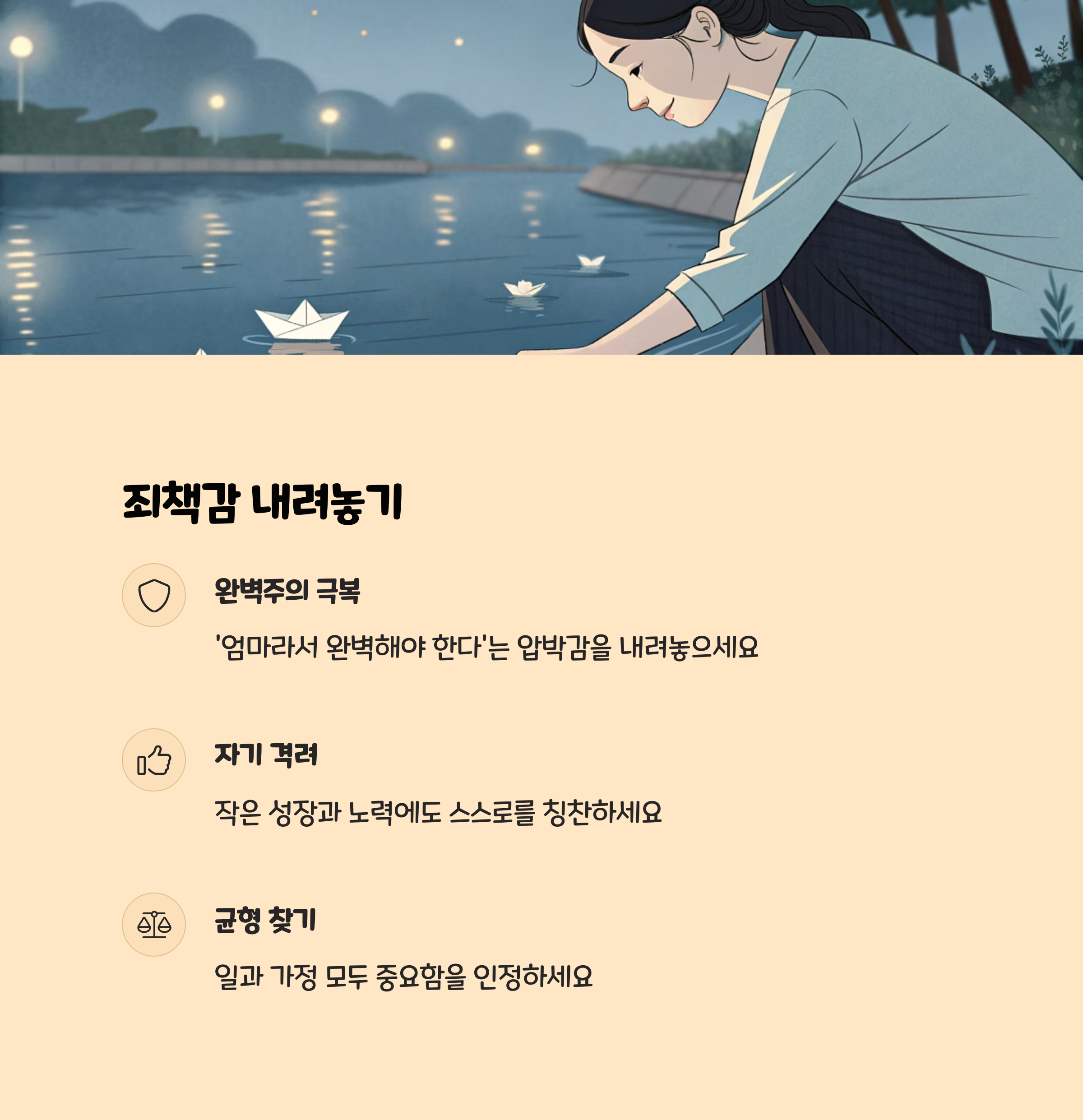 • 자책감 내려놓기 : “내가 이기적인 건 아닐까?”라는 생각은 누구나 합니다. 그러나 이는 정상적인 감정이며, 말로 꺼내고 인정하는 것이 중요합니다.