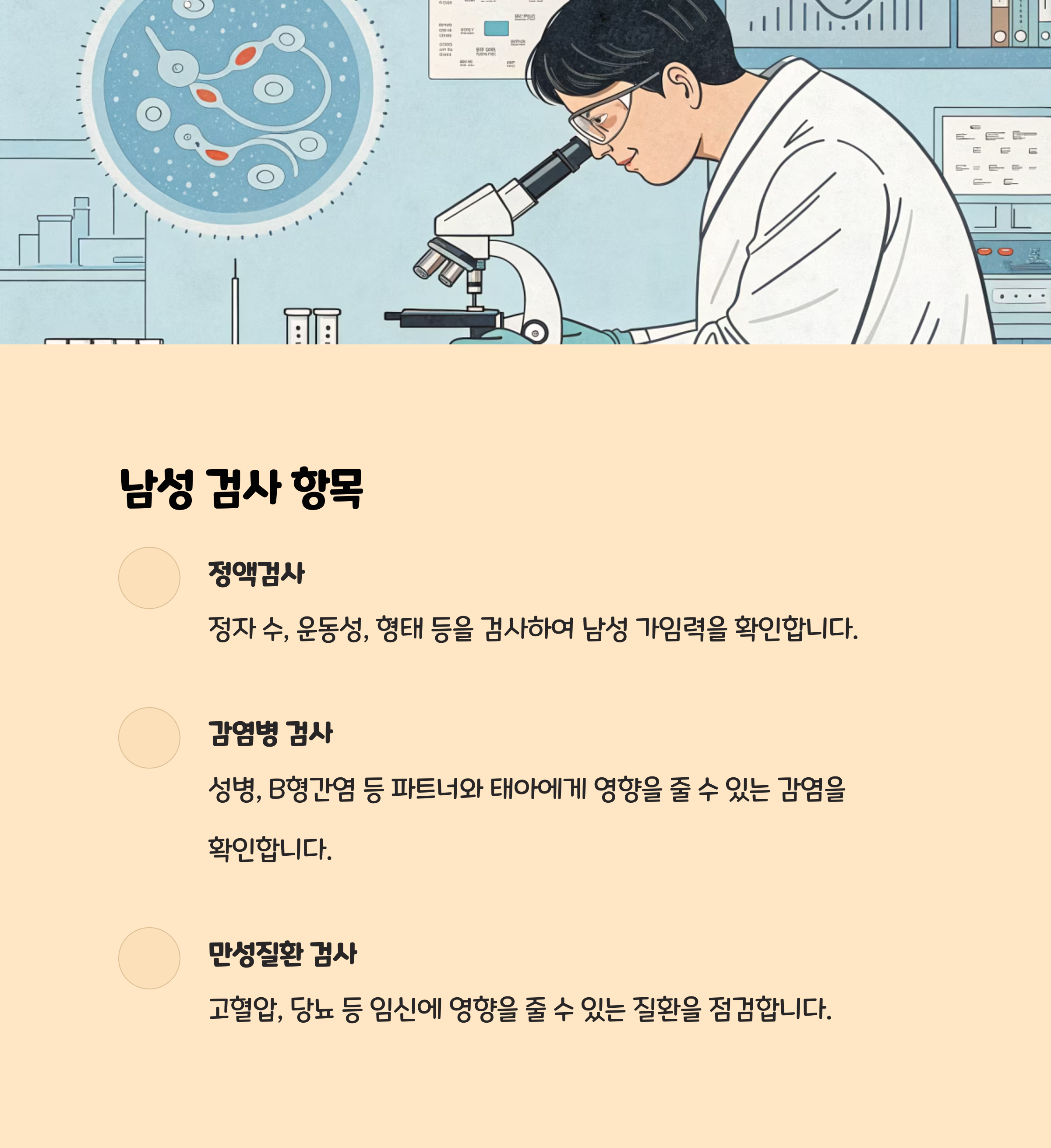 정액검사: 정자 수, 운동성, 형태 등 확인(정확한 결과를 위해 2~4일 금욕 후 검사 권장)호르몬 검사: 테스토스테론, FSH, LH 등감염병 검사: B형 간염, 매독, HIV 등고환·전립선 초음파, 유전자 검사: 필요시 추가.