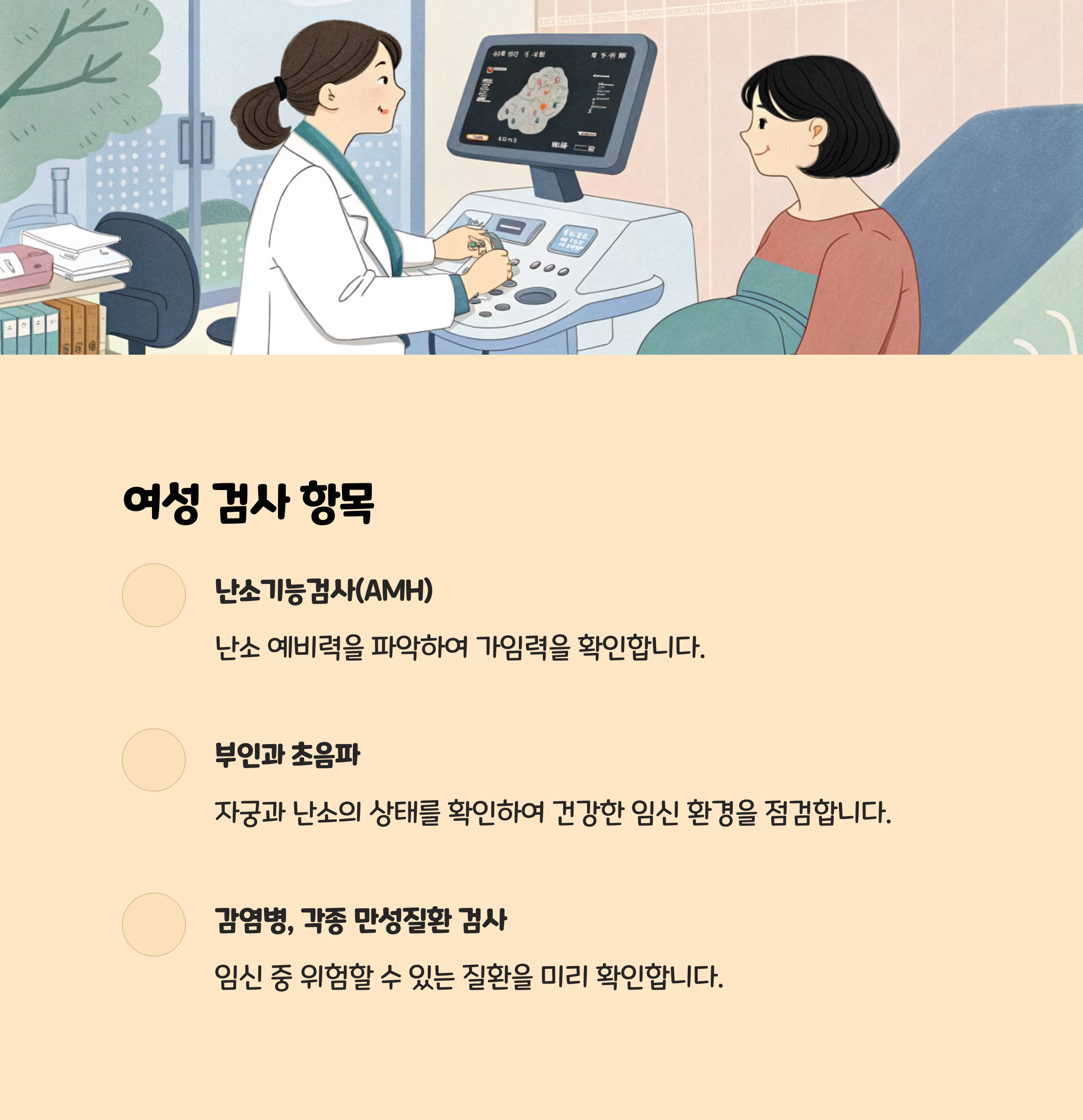 난소기능검사(AMH): 난소의 예비력과 가임력 평가부인과 초음파: 자궁, 난소, 난관 이상 여부 확인호르몬 검사: 배란, 생리주기, 갑상선 기능 등 파악감염병 검사: 풍진, B형 간염, 매독, HIV, 결핵 등자궁경부암 검사: 자궁경부세포검사, 필요시 유방 초음파 추가유전자 검사: 가족력이나 희귀 질환 위험이 있는 경우 권장.