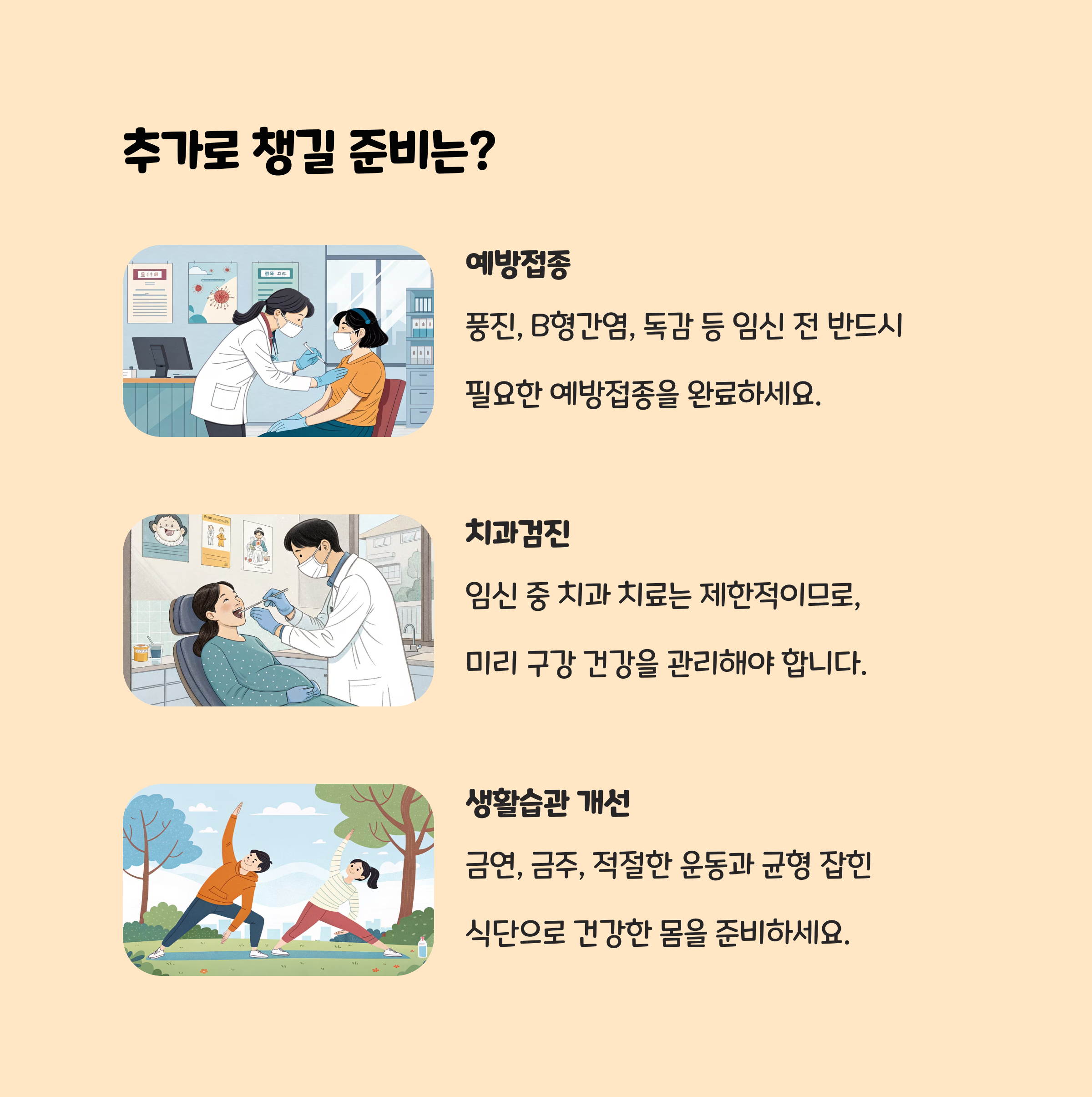 치과검진: 치주염은 조산 위험을 높이므로 임신 전 치료 권장눈 검사: 시력 이상은 임신 전 교정 필요예방접종: 풍진, 수두 항체 없을 경우 임신 전 접종(접종 후 1개월 피임 권장).