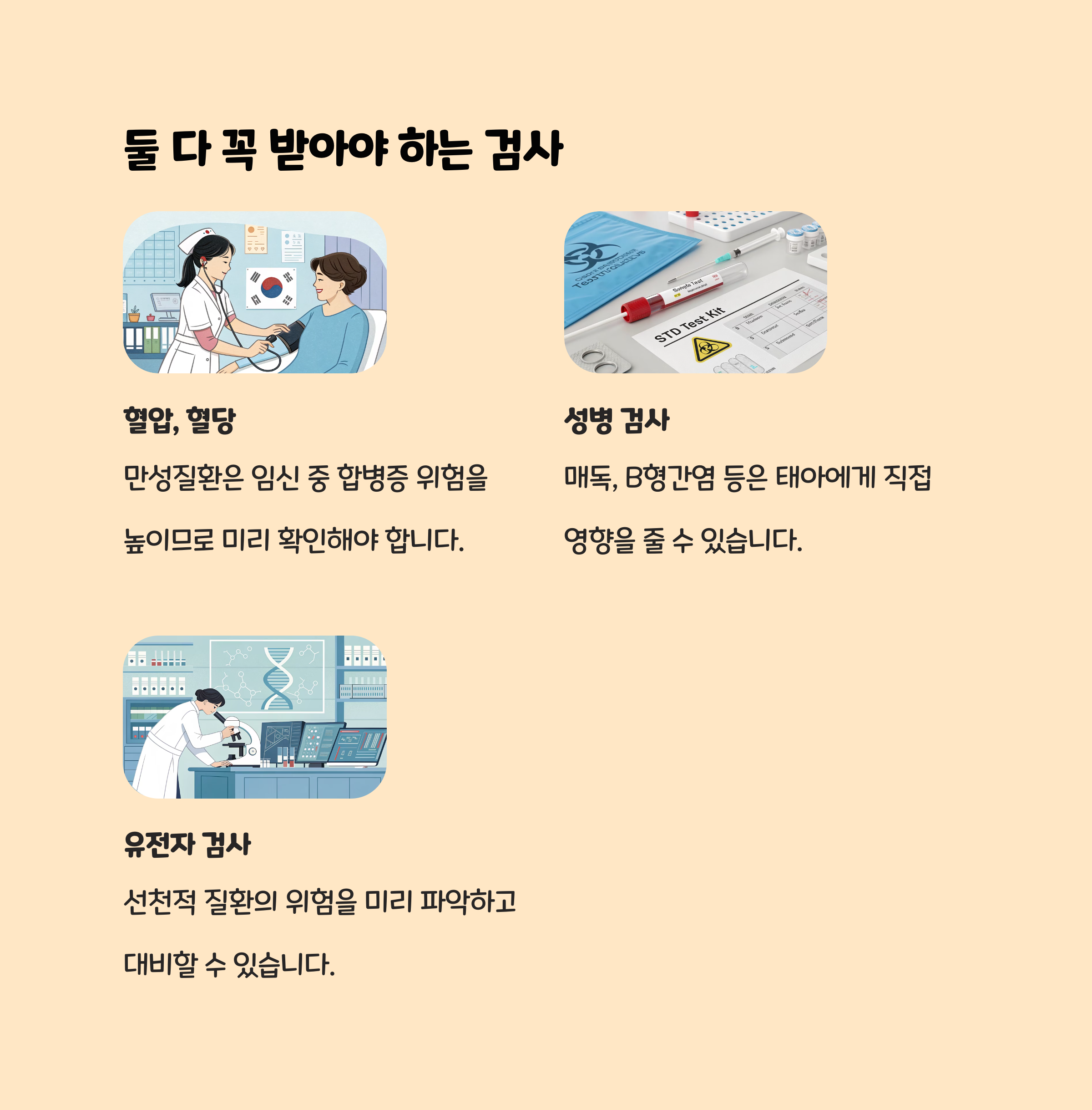 혈액형 및 Rh 인자 검사: 태아 용혈 위험 확인기초 건강검진: 간·신장 기능, 혈압, 혈당, 지질 등성병 검사: 매독, 임질, 클라미디아 등.