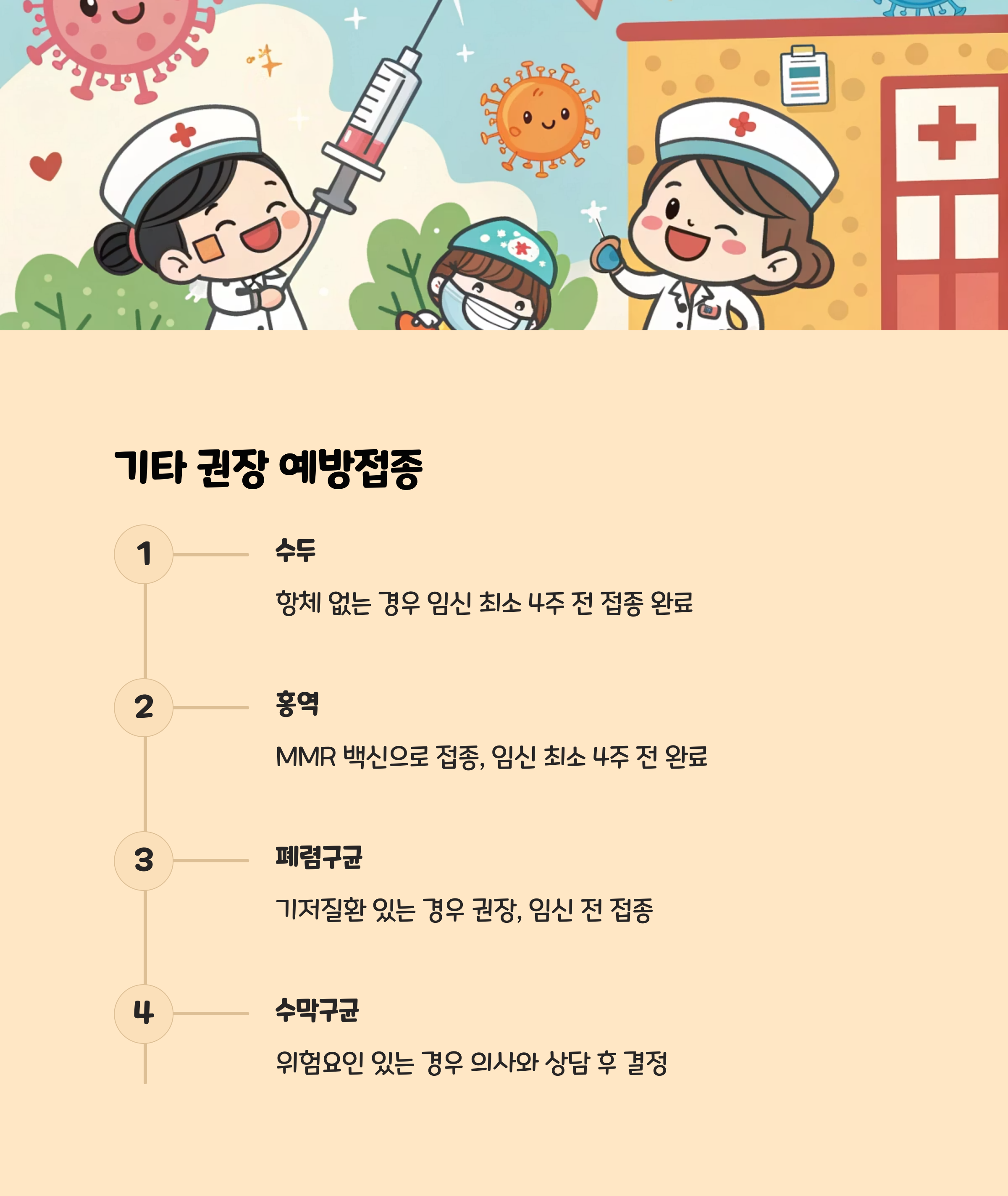 - 풍진(MMR), 수두 등 생백신은 접종 후 최소 1개월(4주)간 임신을 피해야 합니다.