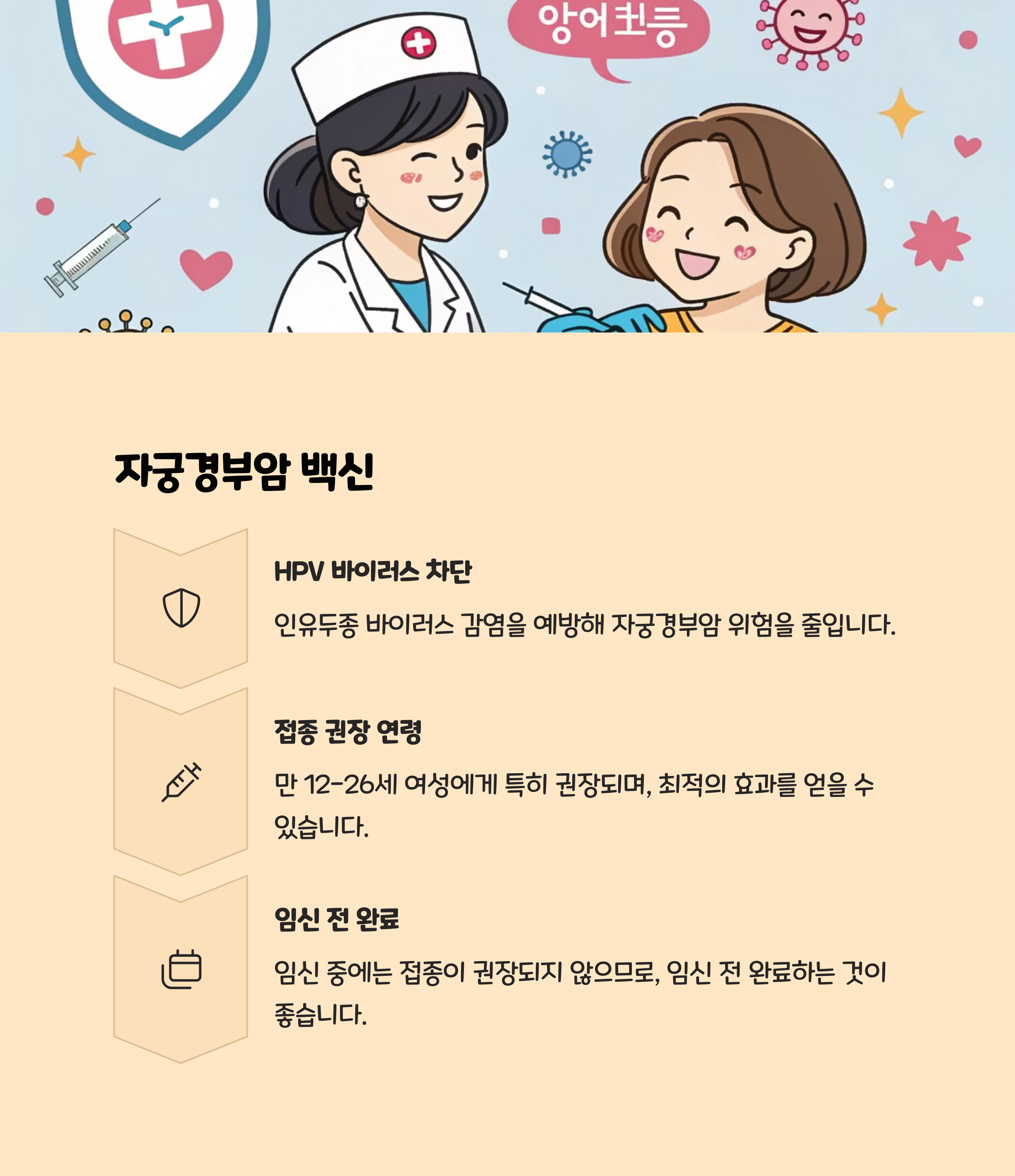 - 자궁경부암은 인유두종 바이러스(HPV) 감염이 원인으로, 예방접종으로 90% 이상 예방 가능합니다.