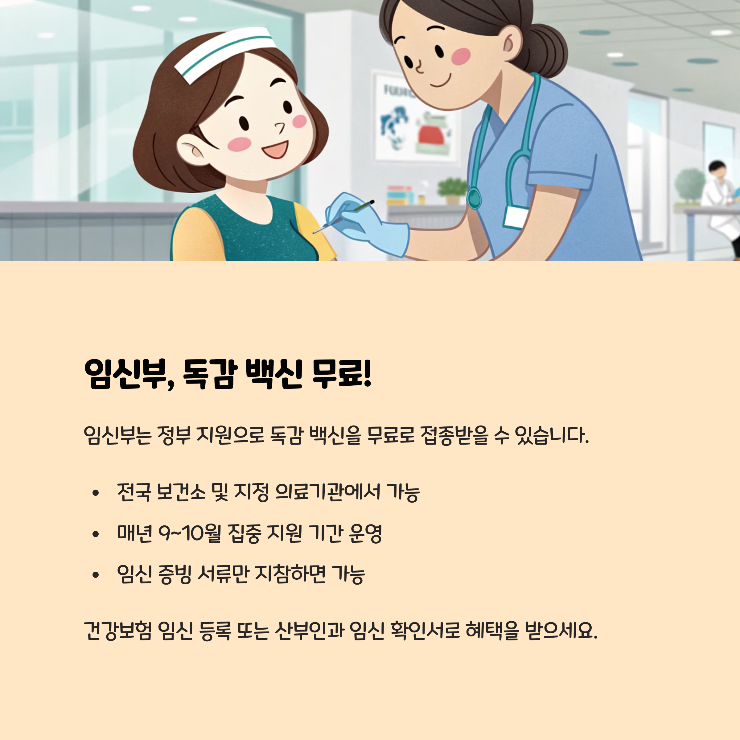 - 임신 시기와 관계없이 접종이 가능하며, 매년 가을~겨울에 맞는 것이 좋습니다. 임신부는 국가 지원으로 무료 접종이 가능합니다.