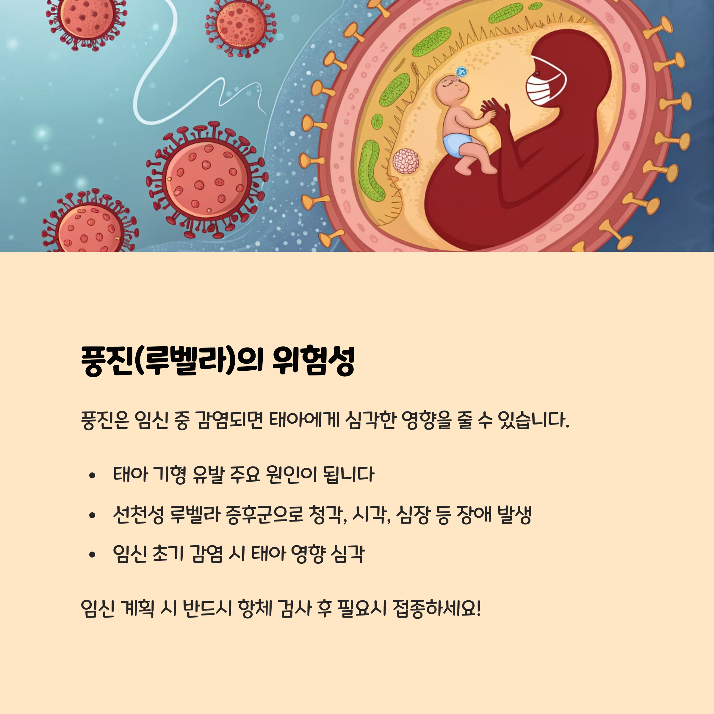 - 풍진은 임신 11주 이내 감염 시 태아의 선천성 기형 위험이 매우 높으며, 선천성 풍진 증후군(CRS)으로 이어질 수 있습니다.
