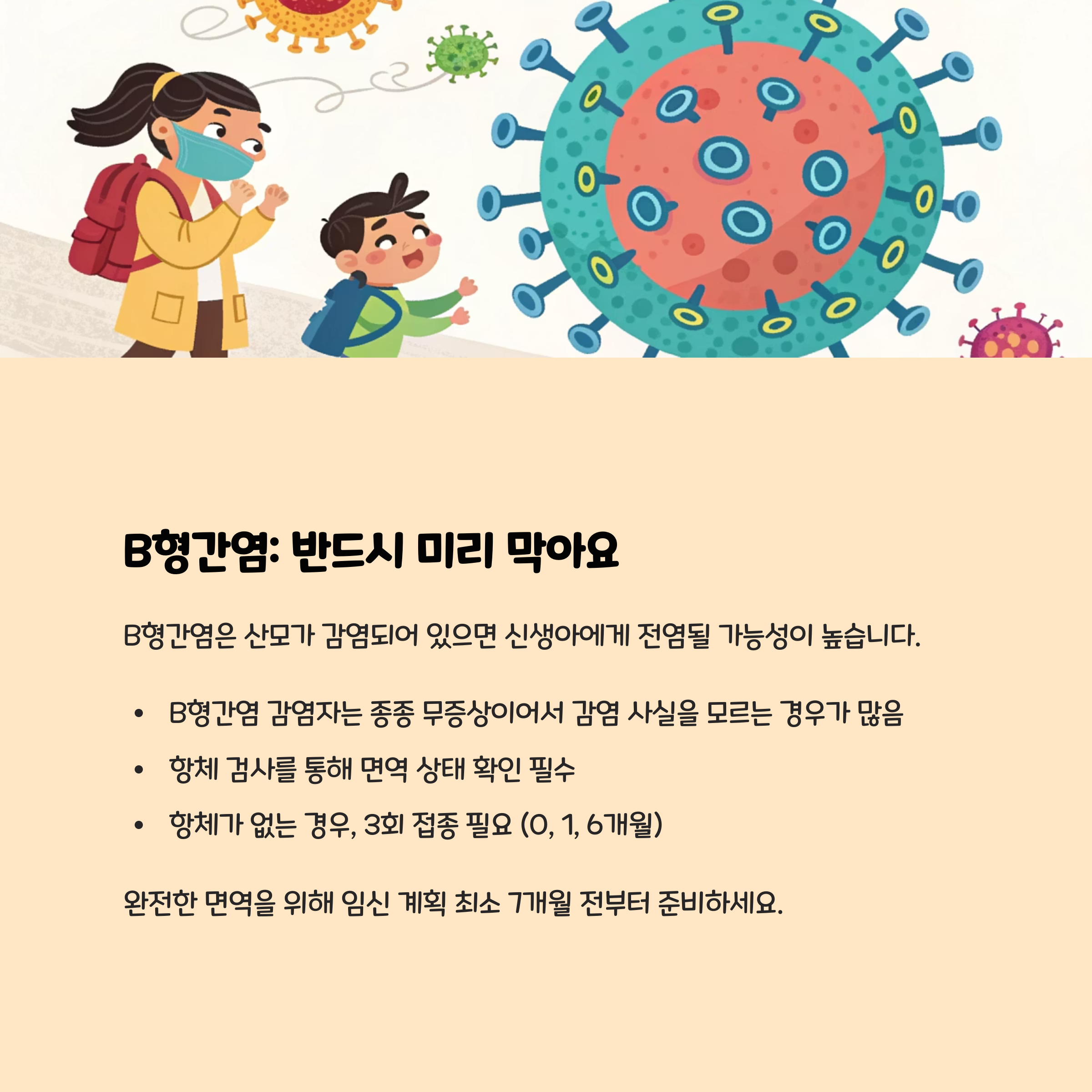 임신 중에는 일부 백신이 금기이거나, 감염병에 걸릴 경우 태아에게 심각한 영향을 줄 수 있습니다. 특히 풍진, B형간염 등은 산모 감염 시 태아에게 선천성 기형이나 만성 질환을 남길 수 있어, 임신 전 항체 유무 확인과 적절한 접종이 필수입니다.