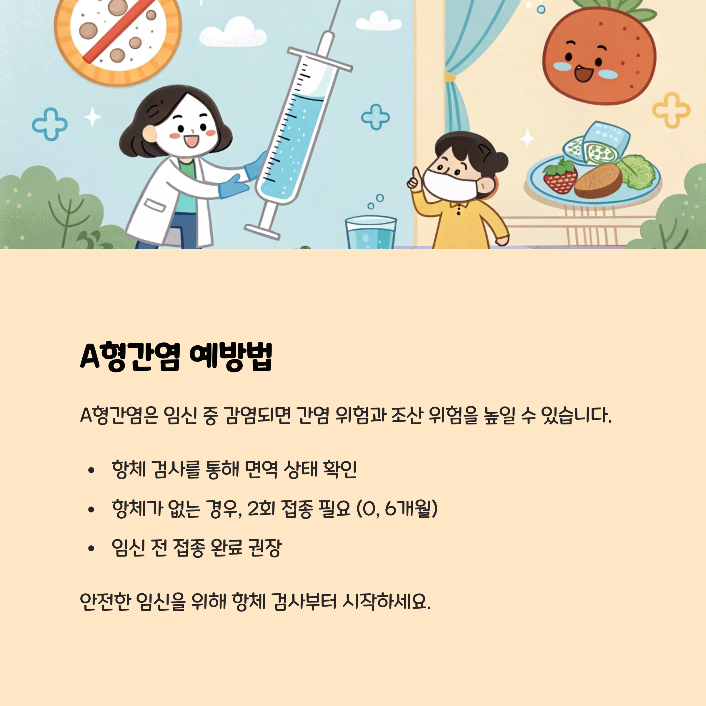 - A형간염은 오염된 음식이나 물을 통해 감염되며, 임신 중 감염 시 조산 위험이 있습니다.