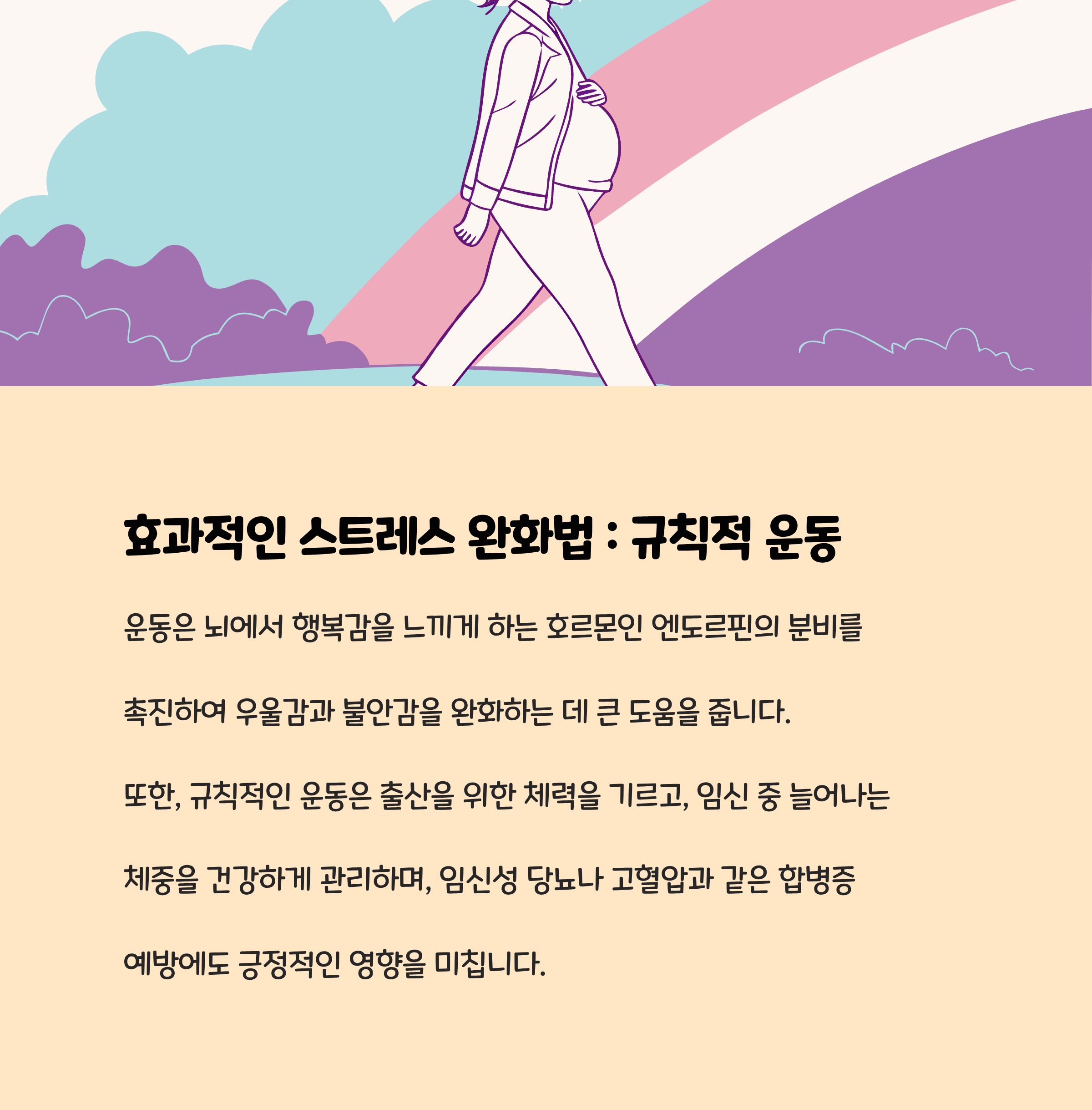 과도한 스트레스는 조산, 저체중아 출산 위험을 높일 수 있고, 분만 과정에서 통증과 회복에도 부정적인 영향을 줍니다. 심리적 안정을 유지하는 것이 건강한 출산에 중요합니다.