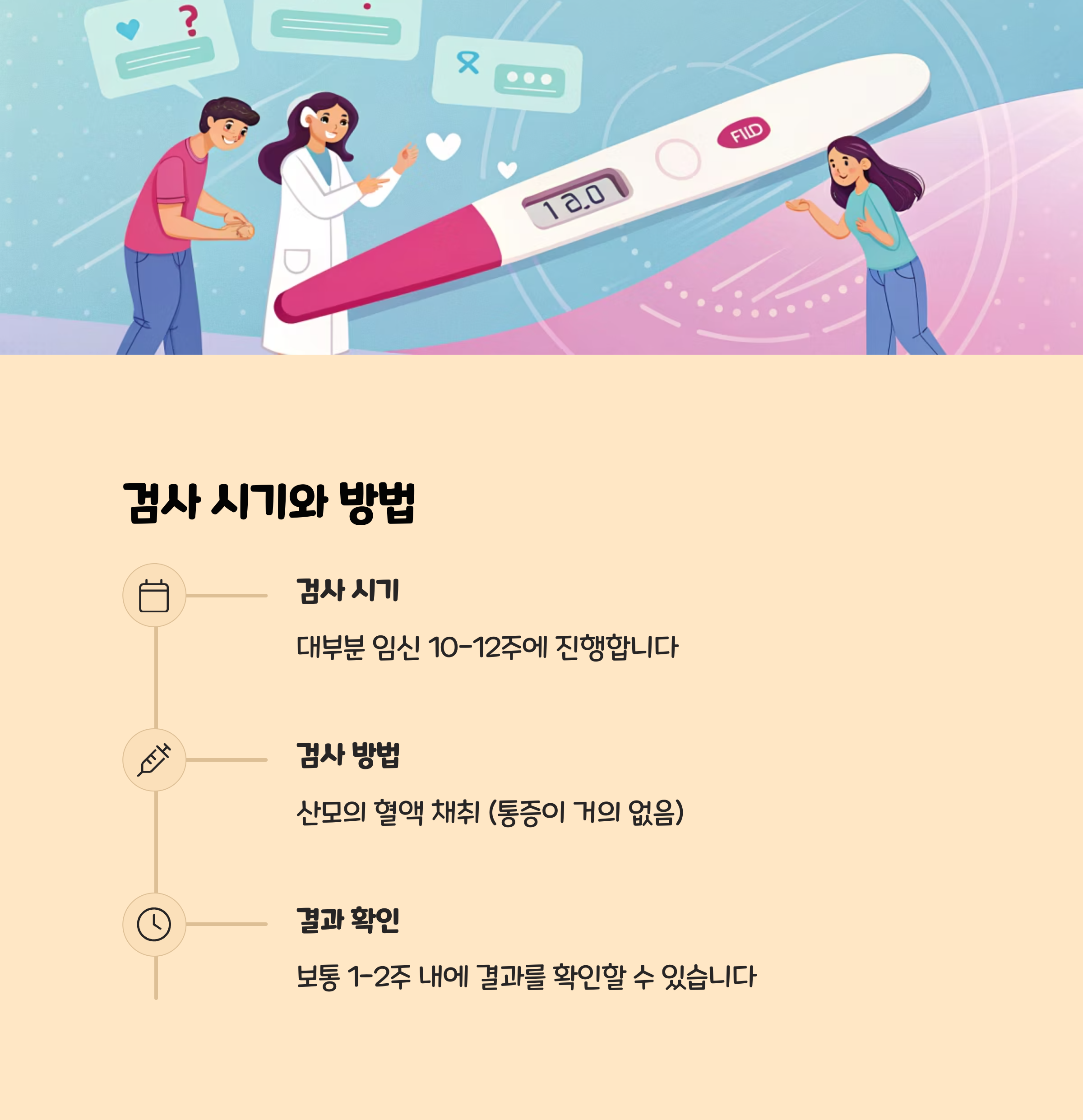 검사 시기: 대부분 임신 10~12주에 진행검사 방법: 산모의 혈액 채취(통증이 거의 없음)소요 시간: 결과는 보통 1~2주 내 확인 가능정확도: 다운증후군 등 주요 질환에서 99% 이상의 민감도를 보이지만, 모든 유전질환을 100% 진단할 수 있는 것은 아닙니다.