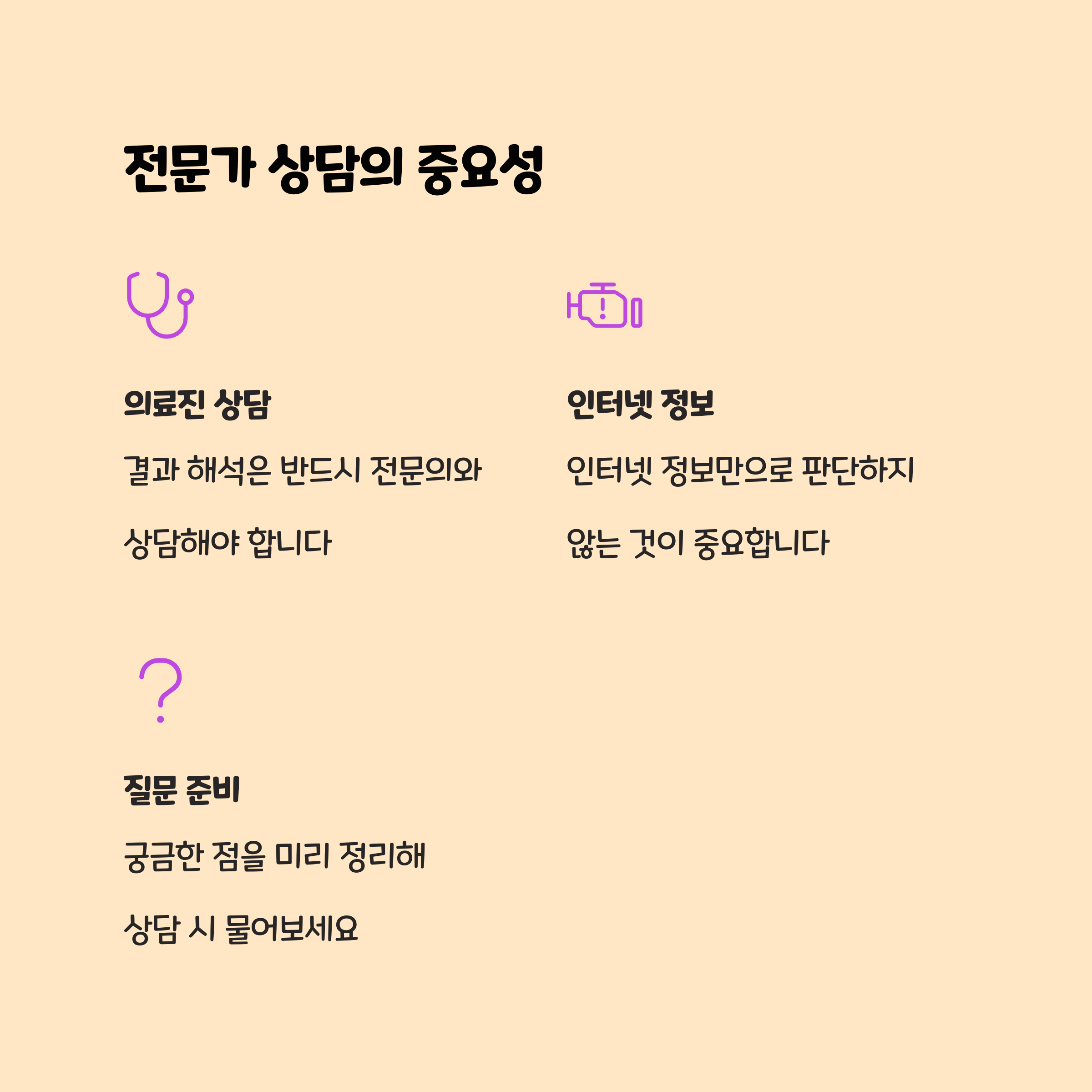 - 신뢰할 수 있는 병원 또는 전문 검사기관 선정