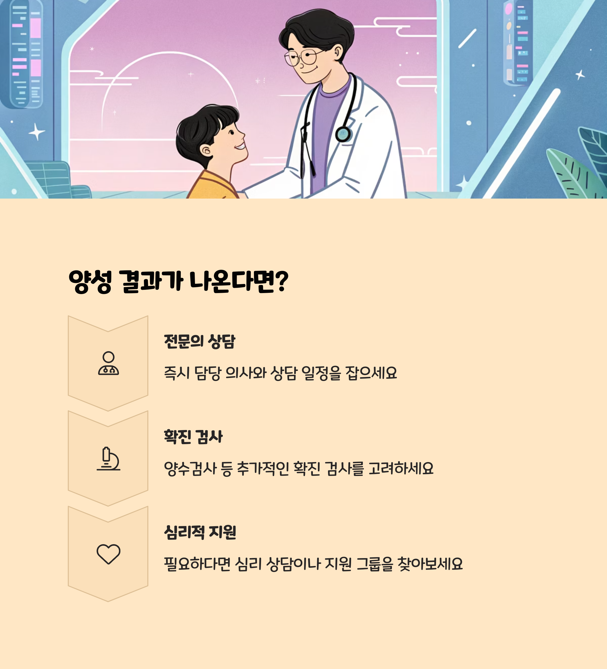 - 양성 결과 시 추가 검사 및 상담 일정 미리 계획