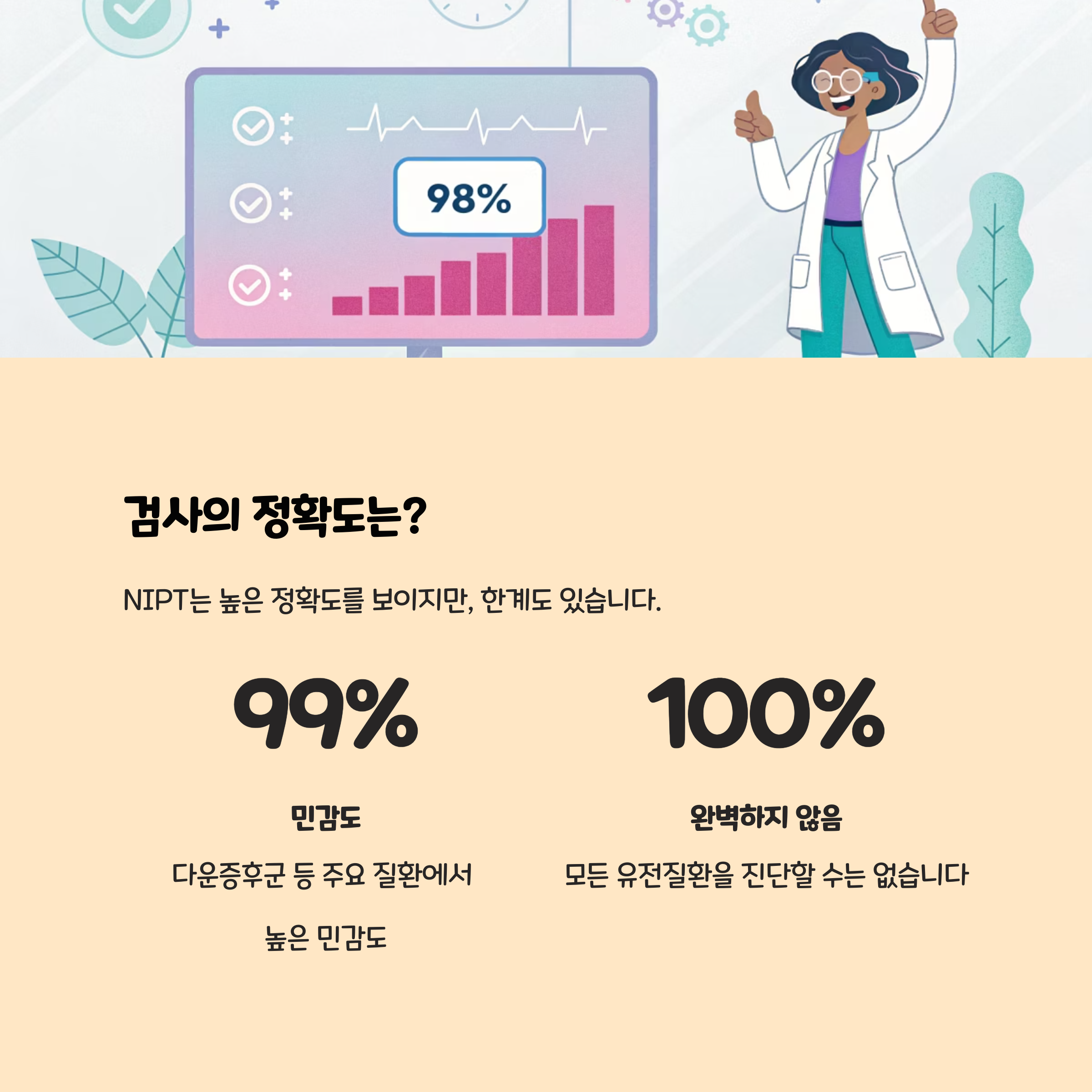 NIPT는 다운증후군 등 주요 염색체 이상에서 99% 이상의 민감도와 특이도를 보입니다. 그러나 모든 유전질환을 100% 진단하지는 못하며, 양성 결과가 나올 경우 추가 확진 검사가 필요합니다. 검사 결과 해석은 반드시 전문의와 상담해야 합니다.