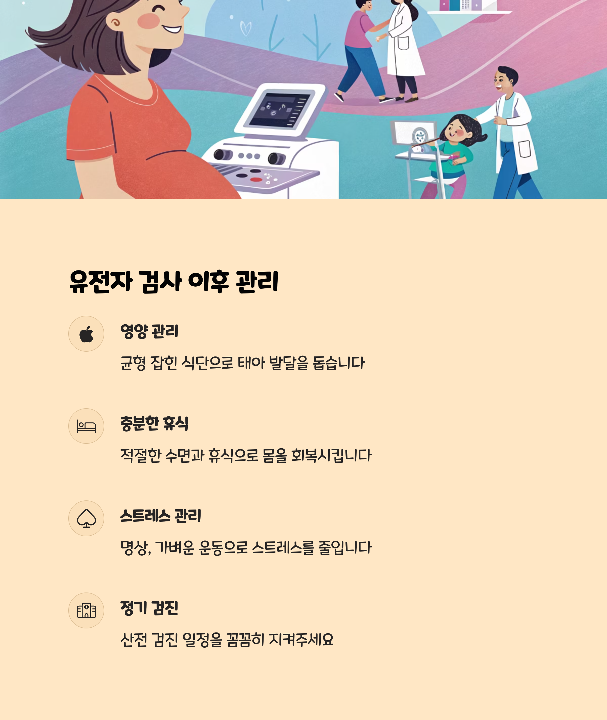 유전자 검사 결과에 따라 추가적인 진단이나 치료가 필요할 수 있습니다. 만약 유전적 이상이 발견되면, 의료진과의 긴밀한 상담을 통해 다음 단계를 결정해야 합니다. 또한 검사 결과와 상관없이, 임신 초기에는 충분한 휴식, 영양 관리, 스트레스 해소가 무엇보다 중요합니다.