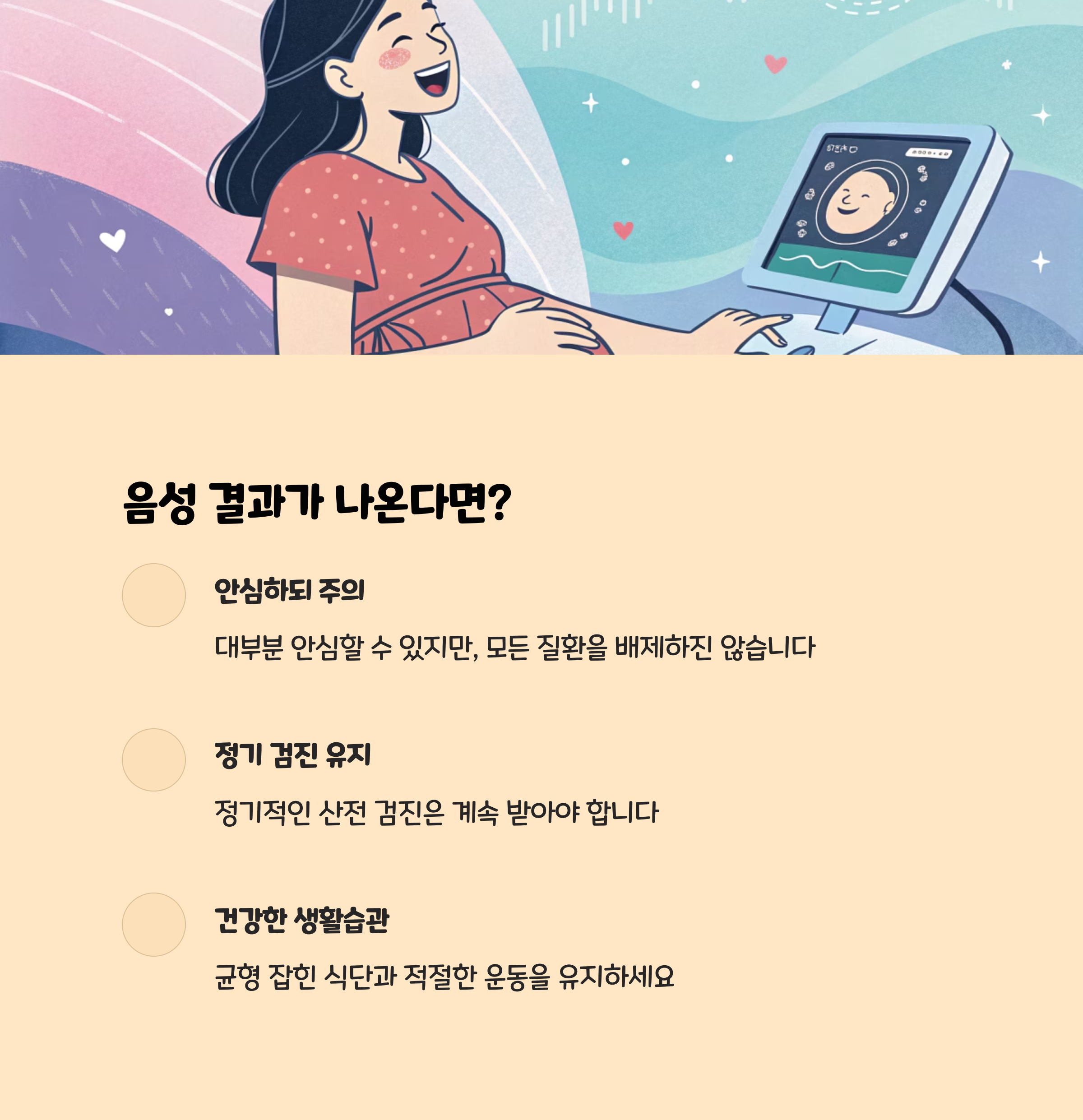 양성 결과: 추가적인 확진 검사(양수검사 등)가 필요음성 결과: 대부분 안심할 수 있지만, 드물게 진단되지 않는 질환도 존재의료진 상담: 결과 해석은 반드시 전문의와 상담해야 하며, 인터넷 정보만으로 판단하지 않는 것이 중요합니다.