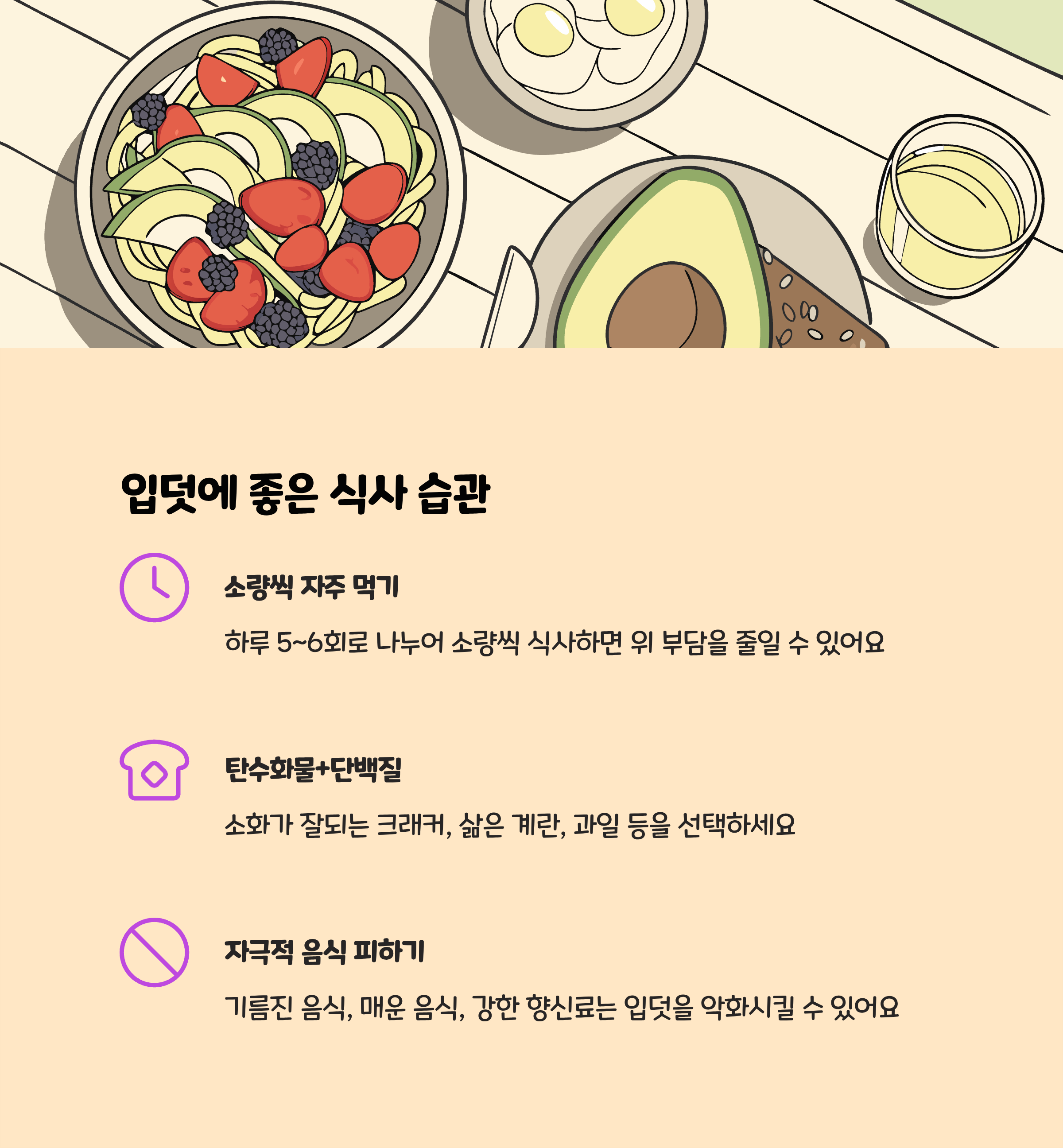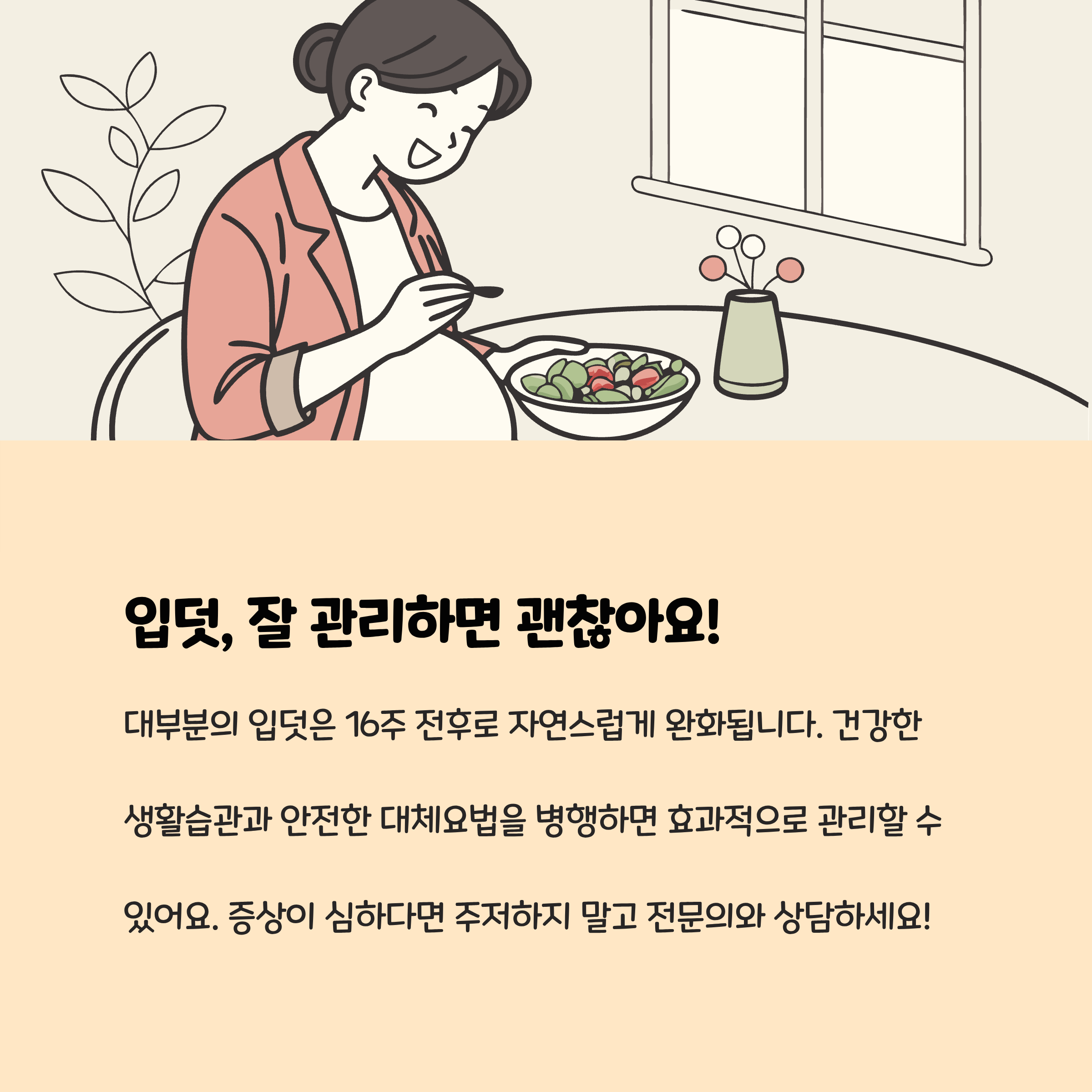 하루 세 번의 큰 식사 대신, 작고 간단한 식사를 5~6회 나누어 드세요. 과식이나 공복 모두 입덧을 악화시키는 원인이 될 수 있습니다.