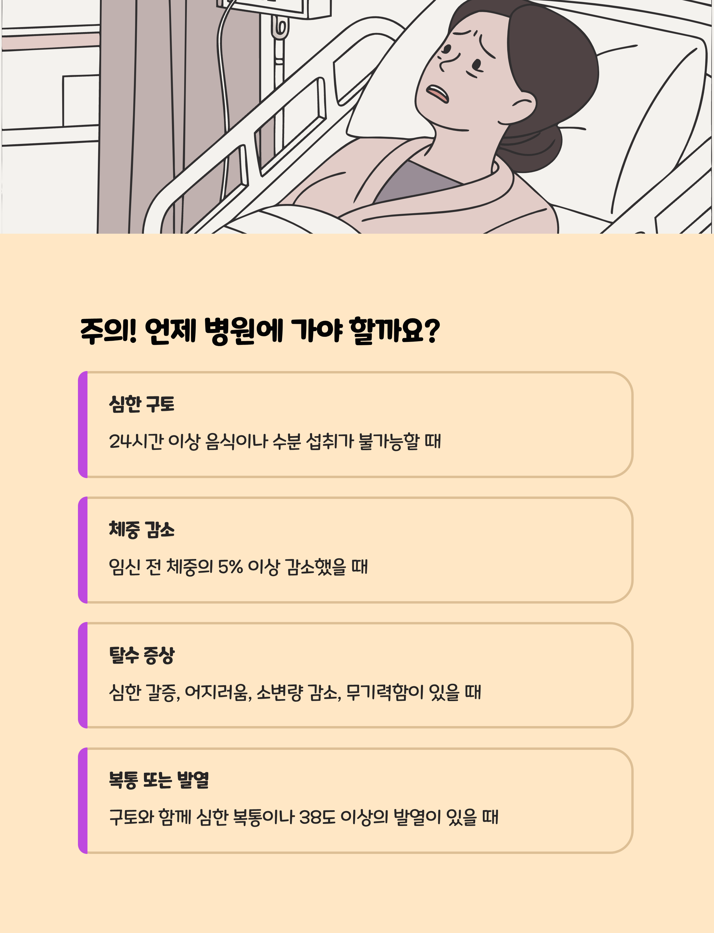 위의 모든 방법에도 불구하고 일상생활이 힘들 정도로 구토가 심하거나, 수분도 섭취하지 못하고 체중이 급격히 줄어들다면 즉시 병원을 찾아야 합니다. 과다구토(hyperemesis gravidarum)일 경우, 수액 치료와 함께 전문 의약품 처방이 필요할 수 있습니다.