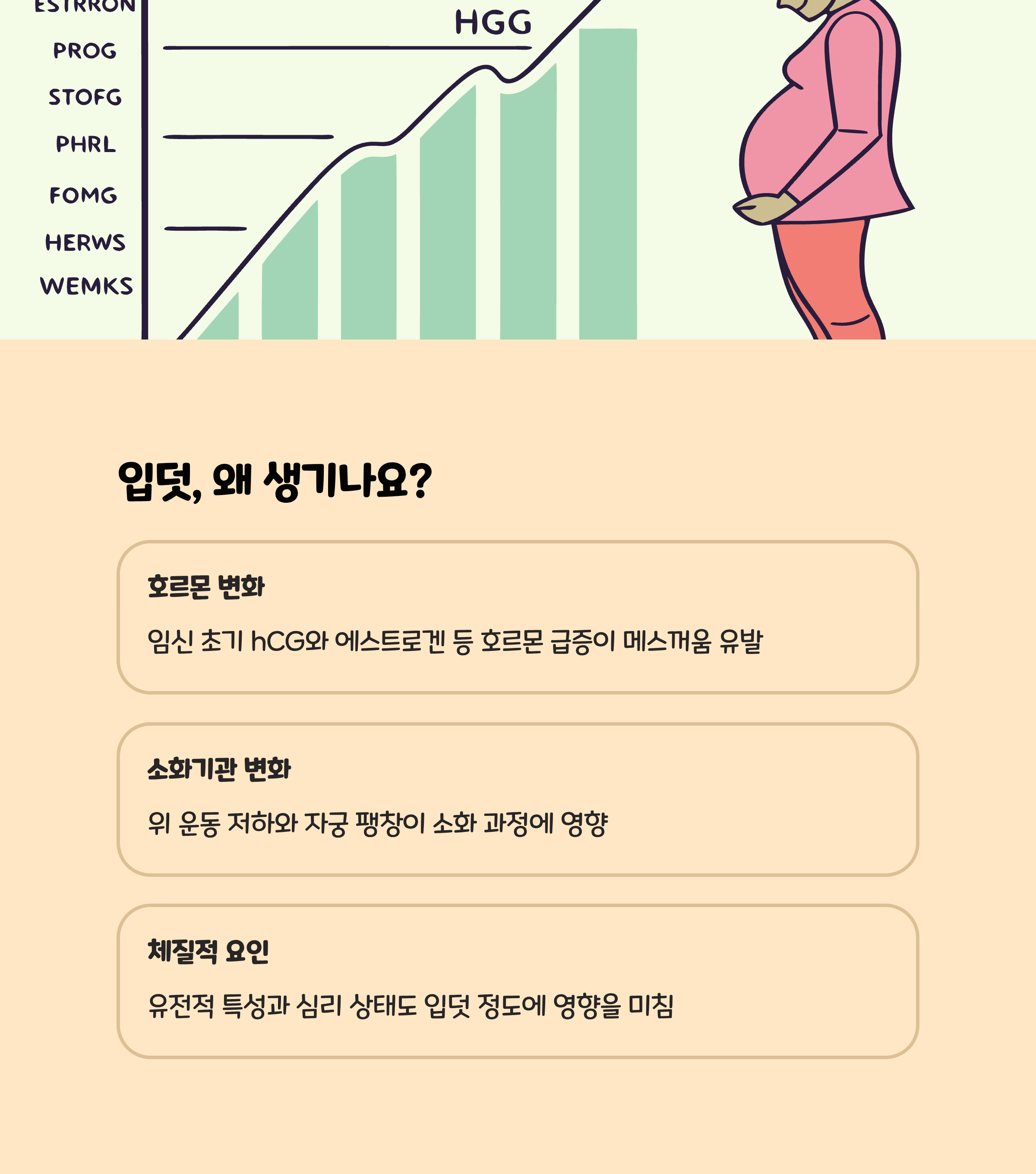 입덧은 임신 호르몬(특히 hCG와 에스트로겐)의 급격한 변화 때문에 발생합니다. 이 호르몬들이 소화기관 및 뇌의 구역질 중추에 영향을 주어 메스꺼움과 구토를 유발하며, 임신 5~6주부터 시작해 12~16주쯤 완화되는 경우가 많습니다.