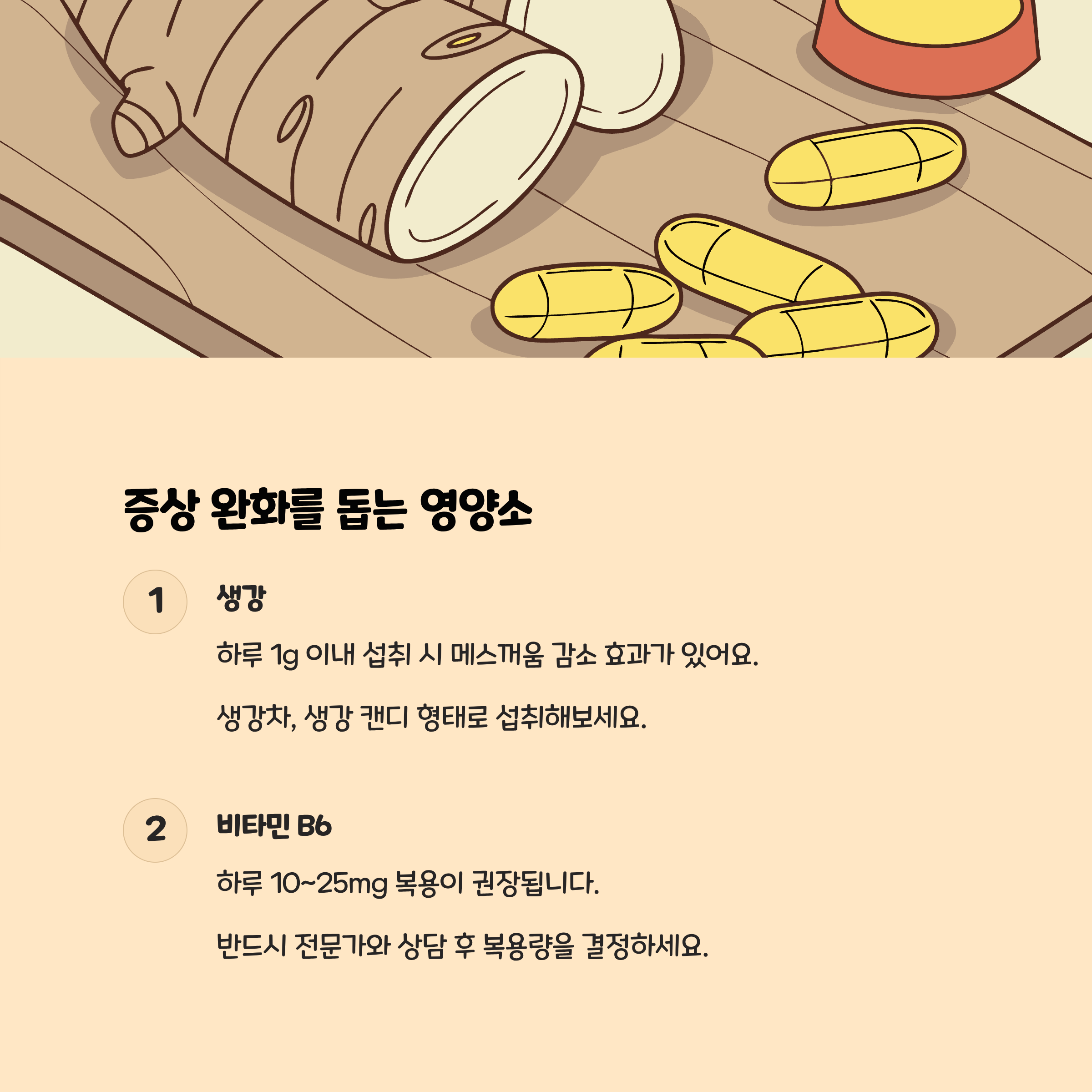 | 비타민 B6 복용 | 10~25mg, 1~3회/일 | 공식 권고, 안전성 높음 | 과다복용 주의, 의사와 상담 |