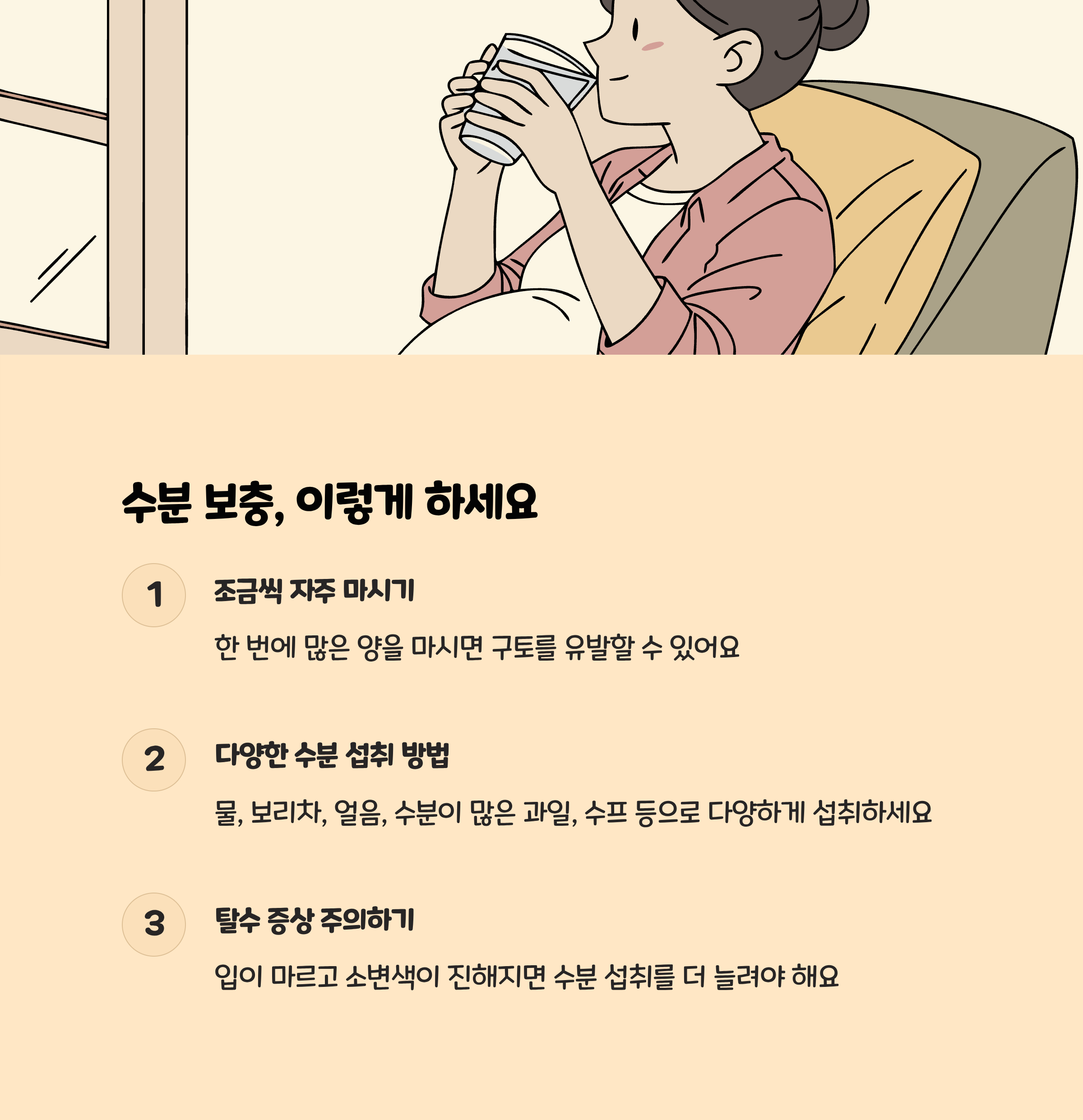 메스꺼움이 심하다면 한 번에 몰아서 마시기보다는 작은 모금씩 천천히 마시는 것이 효과적입니다. 하루 6~8컵(1.2~1.5리터)이 이상적이나, 개인 컨디션에 맞게 조절하세요.