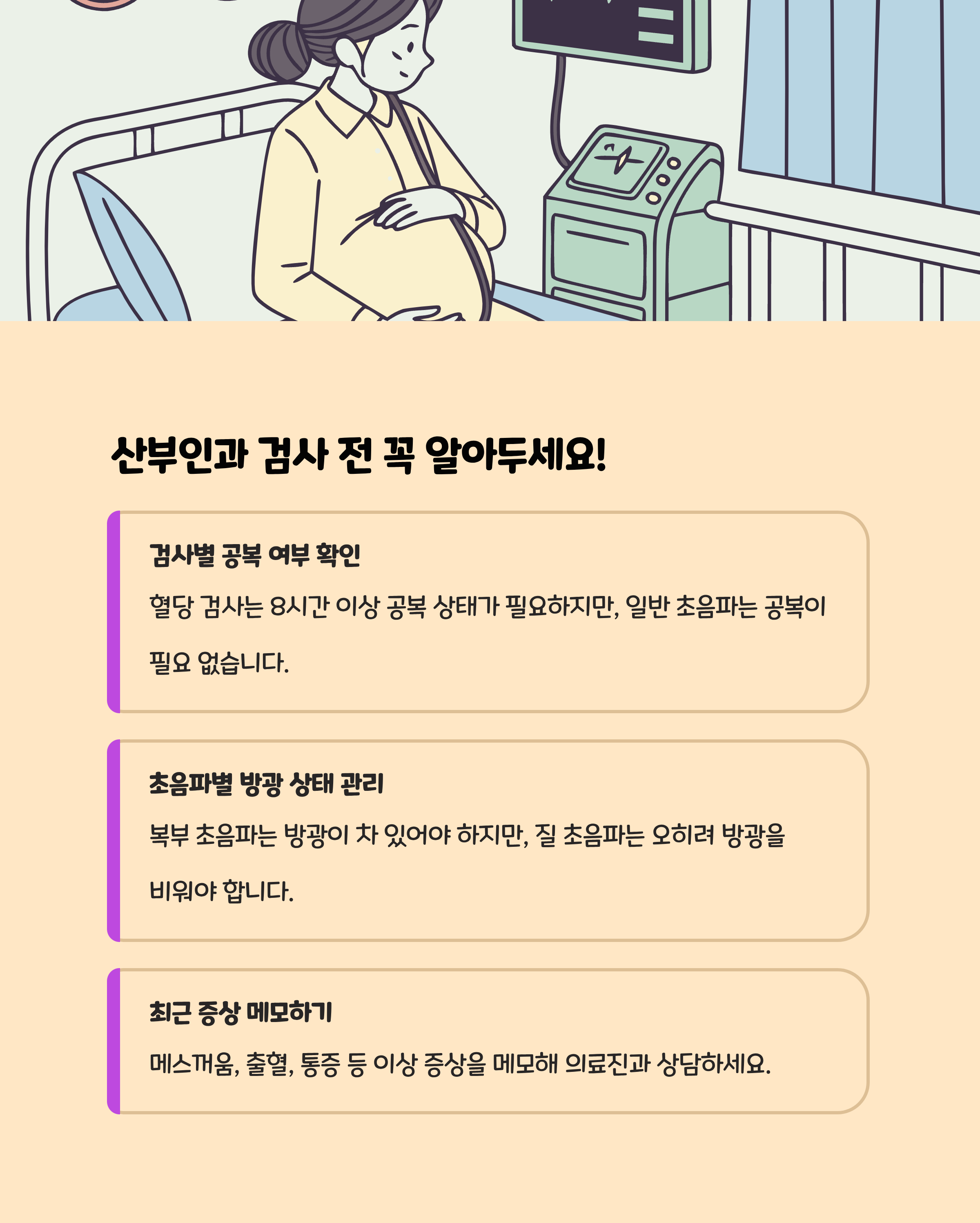 검사 일정 확인: 의료진의 스케줄에 따라 진료요일, 시기 반드시 사전 문의.공복 여부 체크: 일부 혈액검사는 공복 상태를 요구, 병원 사전 안내에 필히 따르세요.복약 중지 관련: 현재 복용 중인 영양제, 의약품이 있다면 사전에 담당의와 상의.방광 상태: 초음파 검사 전 소변을 참는 것이 필요한 경우가 있으니 지정 안내문을 준수.검사 전 컨디션 관리: 과도한 무리, 음주 등은 며칠 전부터 자제하는 것이 좋습니다.