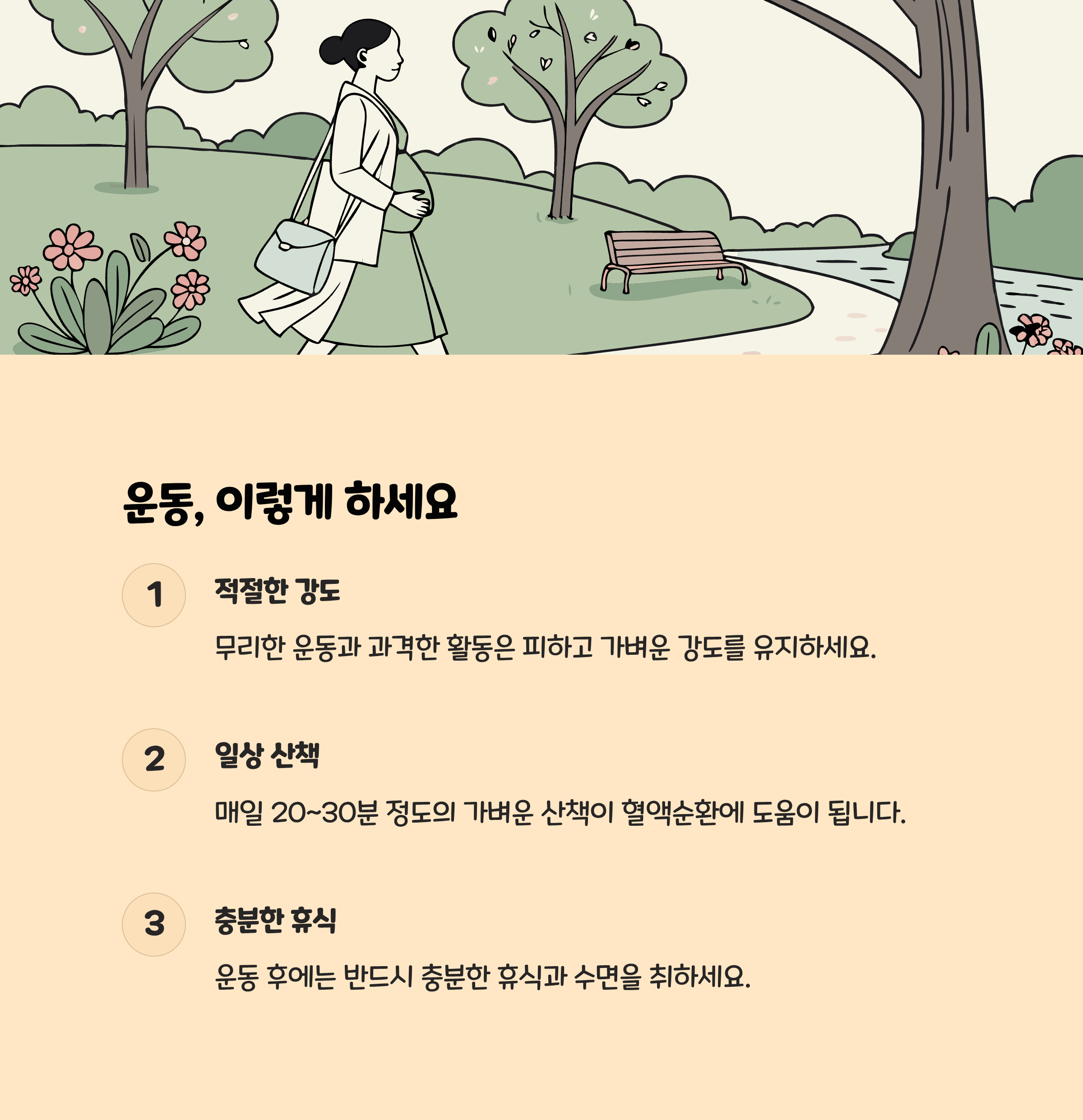 운동 가이드 산책·스트레칭 등 가벼운 운동, 격한 운동·과로 금지