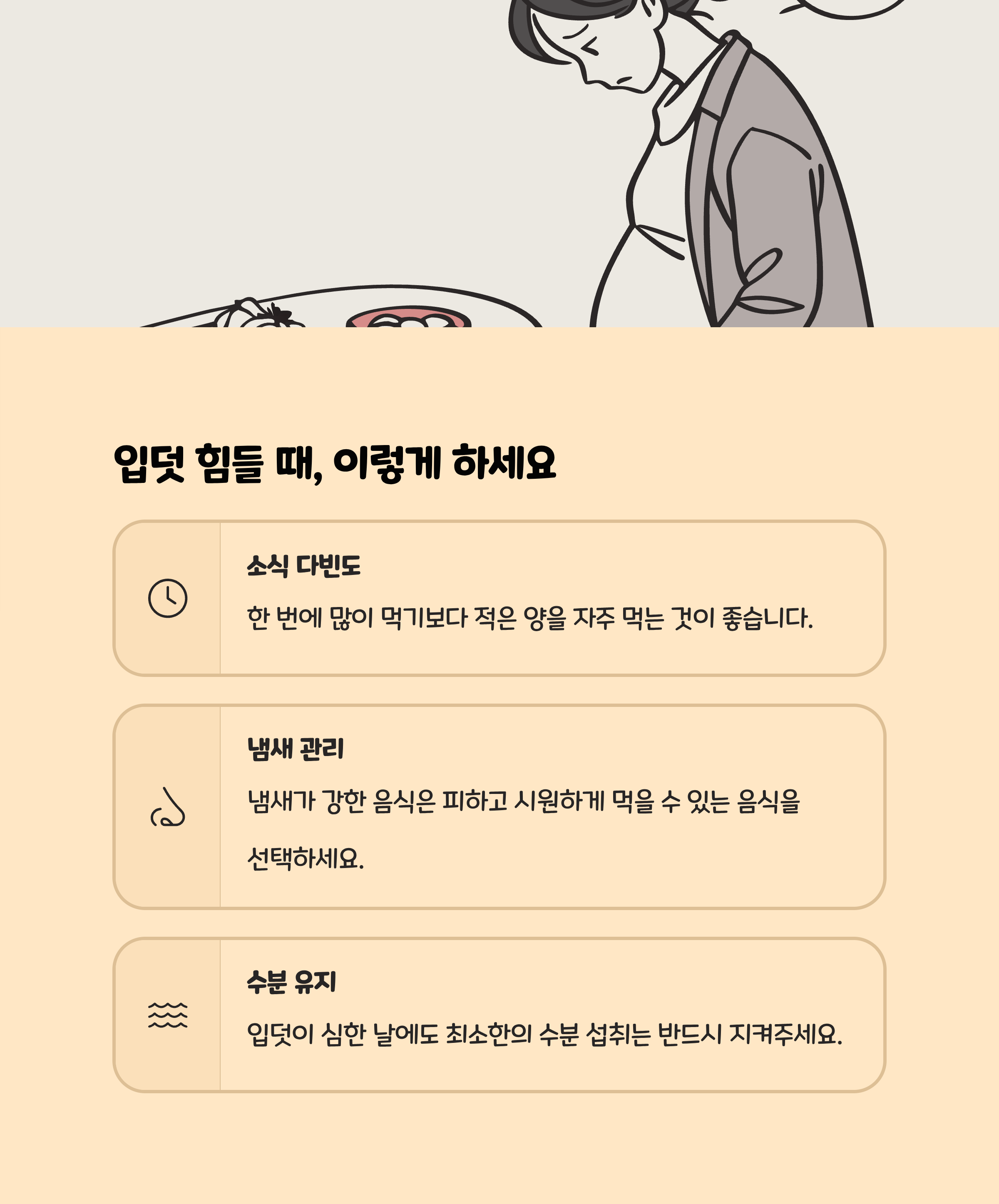 • 음식 냄새에 민감하다면, 비교적 냄새가 적은 음식이나 분할식(적게, 자주 먹기)을 활용합니다.
