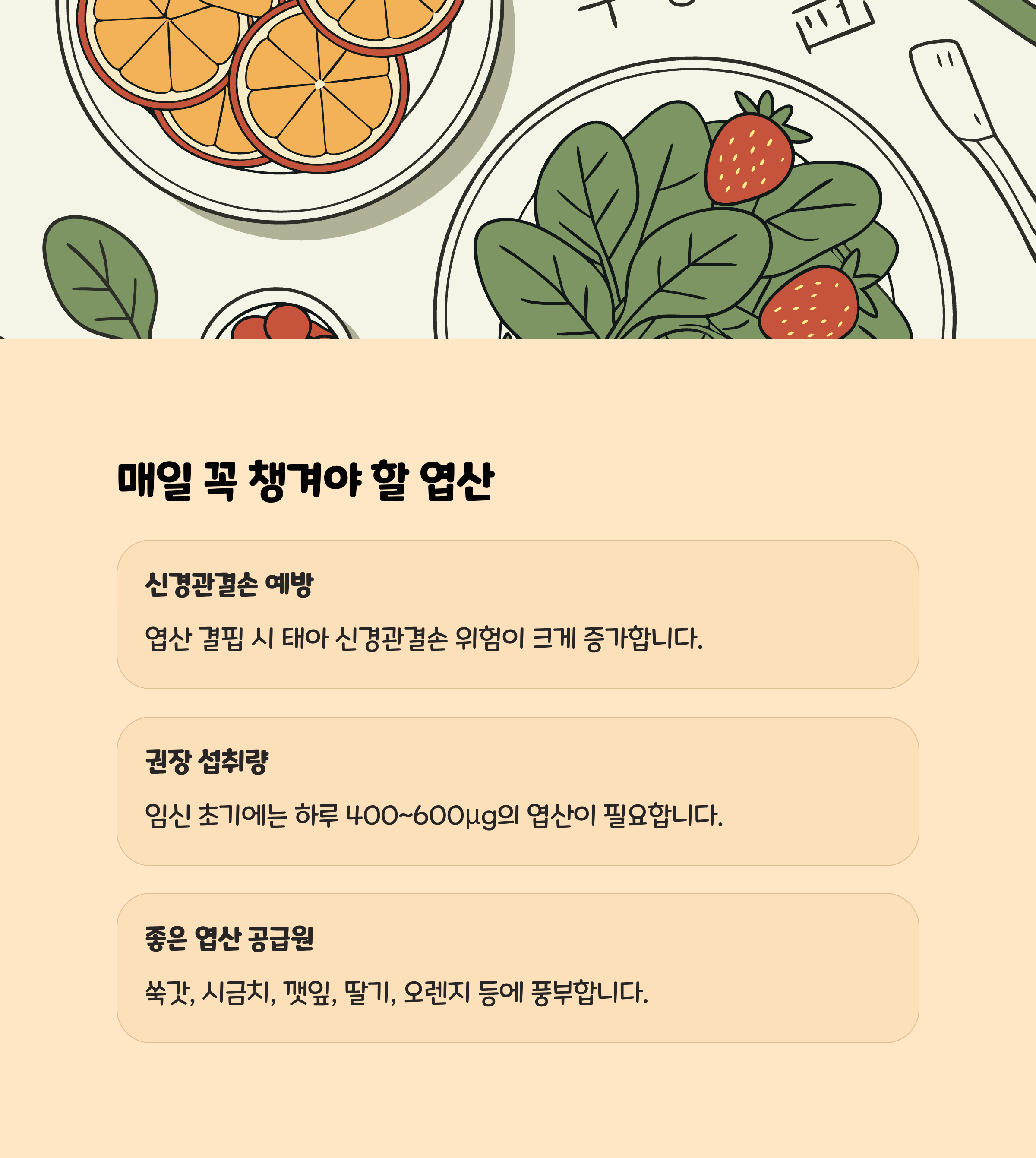 • 엽산은 신경관 결손을 예방하는 중요한 영양소로, 임신 전부터 임신 12주까지 매일 400μg 이상 복용이 권장됩니다.