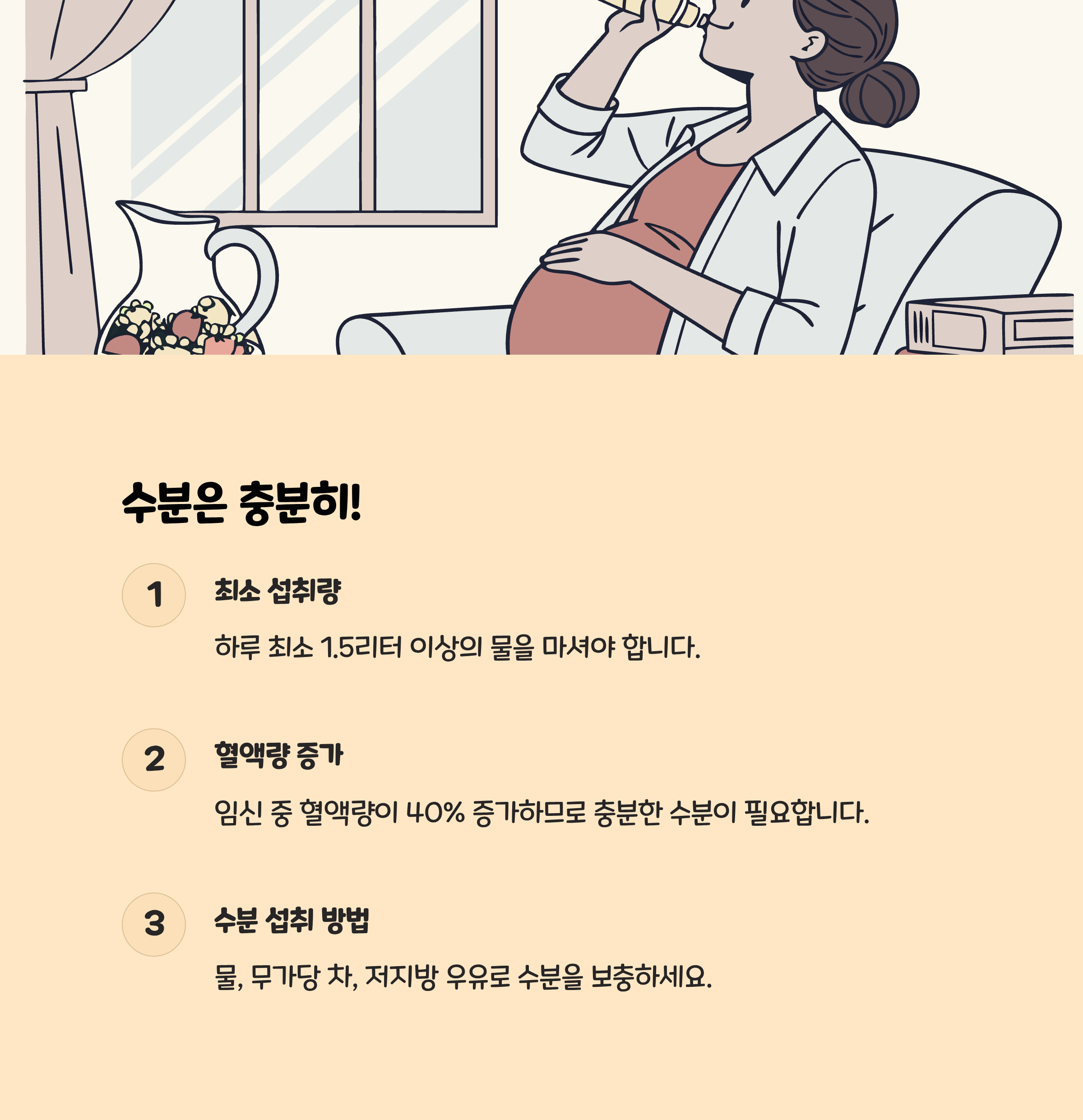 • 수분 부족은 혈액과 양수 생성에 악영향을 미치므로, 탈수 예방을 위해 하루 최소 1.5L 이상의 수분을 섭취해야 하며 입덧이 심할 때도 꾸준히 물을 조금씩 마시는 것이 중요합니다.