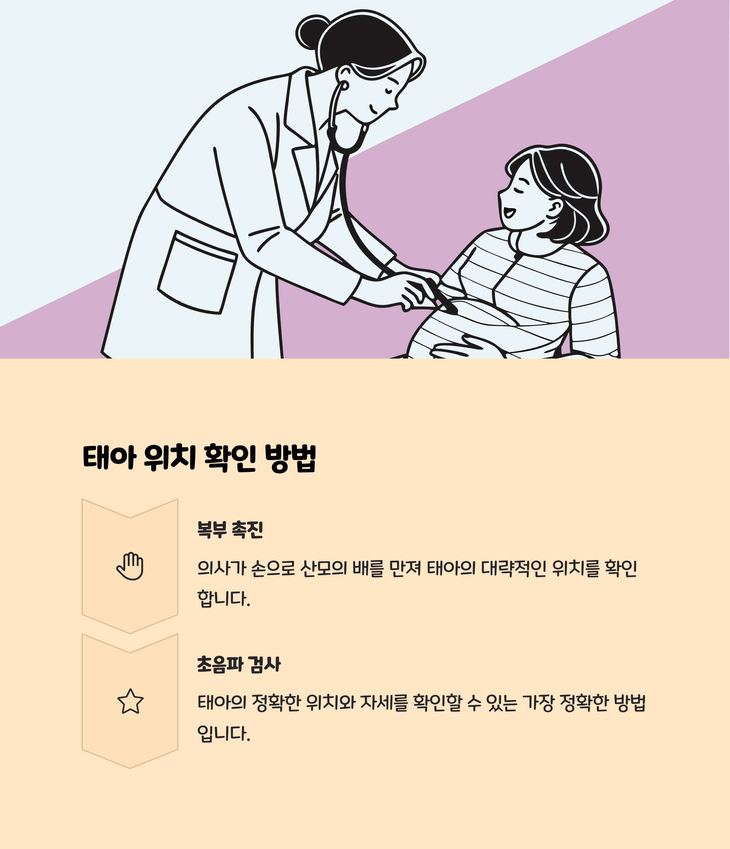 복부 촉진(Leopold’s maneuver): 의사가 산모의 복부를 손으로 눌러 아기의 머리와 등, 엉덩이 위치를 직접 만져 확인합니다.초음파 검사: 가장 정확하며, 태아의 머리, 엉덩이, 등, 팔다리뿐 아니라 태반의 위치와 양수량도 함께 확인합니다. 특히 임신 30주 이후에는 정기적으로 초음파 검사를 받는 것이 좋습니다.비자극 검사(NST): 산모의 배에 기기를 부착해 30분가량 태아의 심박동, 움직임, 자궁수축을 측정하면 태아 건강과 위치 정보를 간접적으로 파악할 수 있습니다.