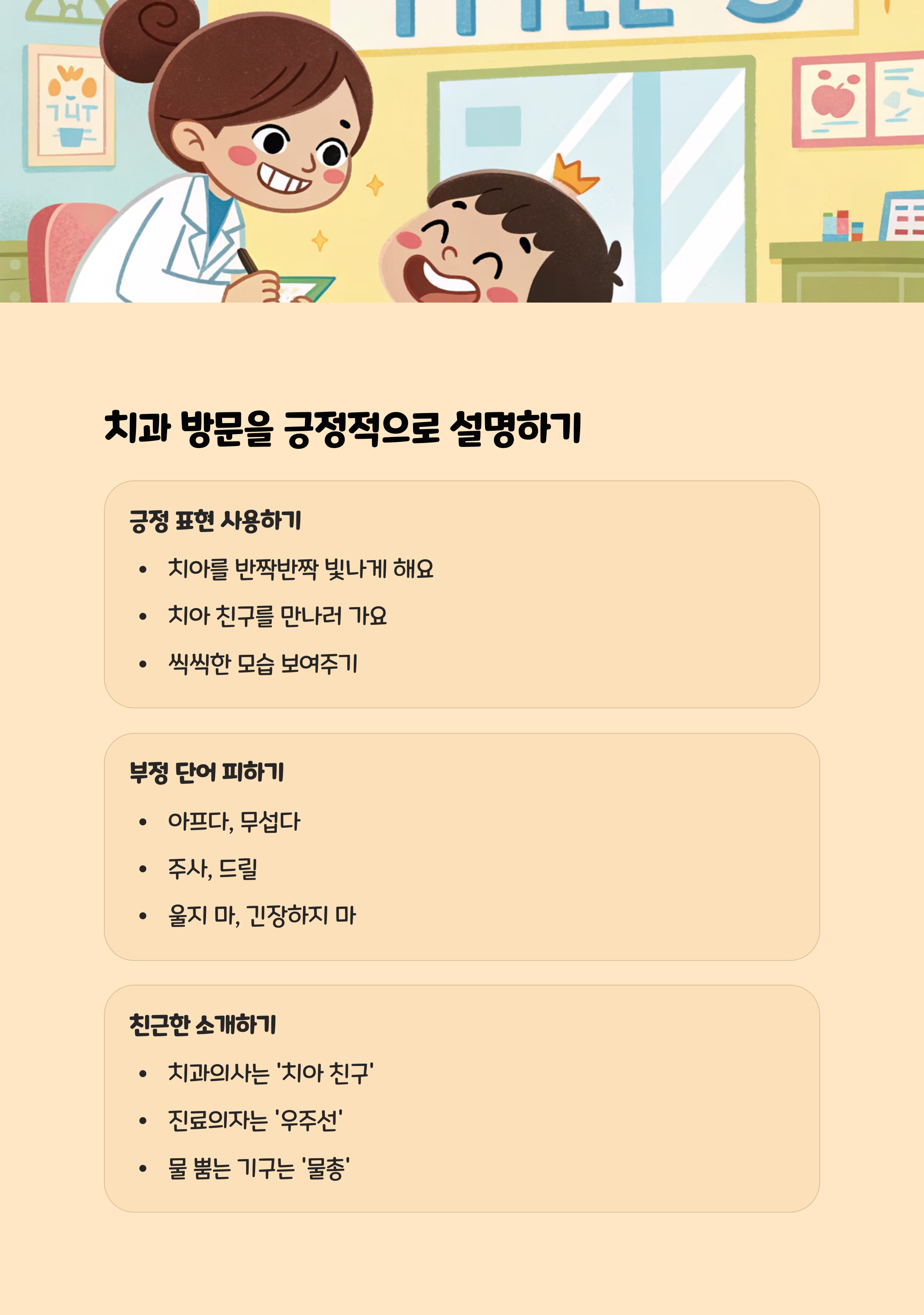 치과에 대해 설명할 때는 긍정적이고 구체적인 언어를 사용하는 것이 중요합니다. 예를 들어, “치과 선생님이 우리 치아를 튼튼하게 만들어줄 거야”, “입을 크게 벌리면 금방 끝날 거야” 등 아이가 안심할 수 있는 표현을 사용하세요. 반면, “조금만 참아, 안 아플 거야”처럼 거짓말로 달래거나, “안 하면 주사 맞아”와 같은 부정적 표현은 오히려 공포심을 키울 수 있으니 피해야 합니다.