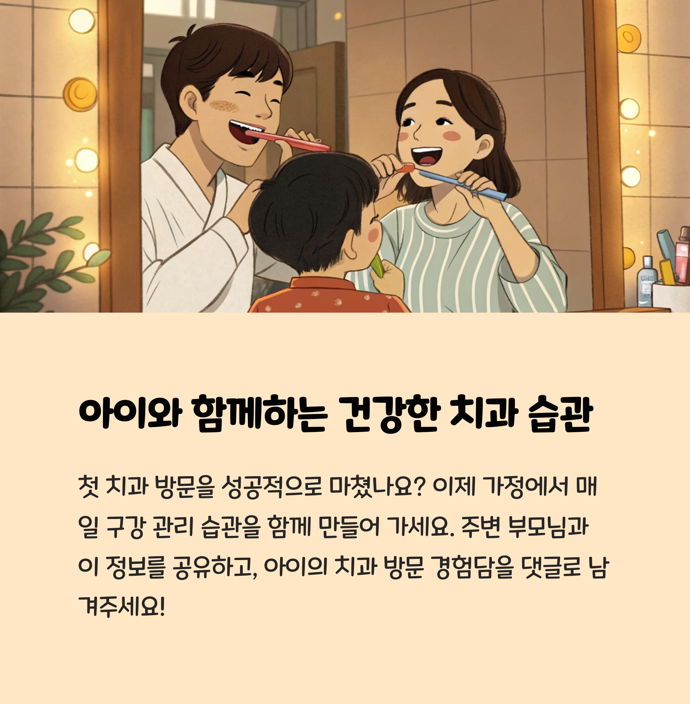 7세 자녀를 둔 한 부모는 진료 전 인형을 활용해 치과놀이를 여러 번 해보았고, 실제 방문 시 아이가 낯설지 않아 협조도가 높았다고 합니다. 진료실에서 부모가 침착하게 의료진을 믿고 맡긴 것이 긍정적 결과로 이어졌습니다.