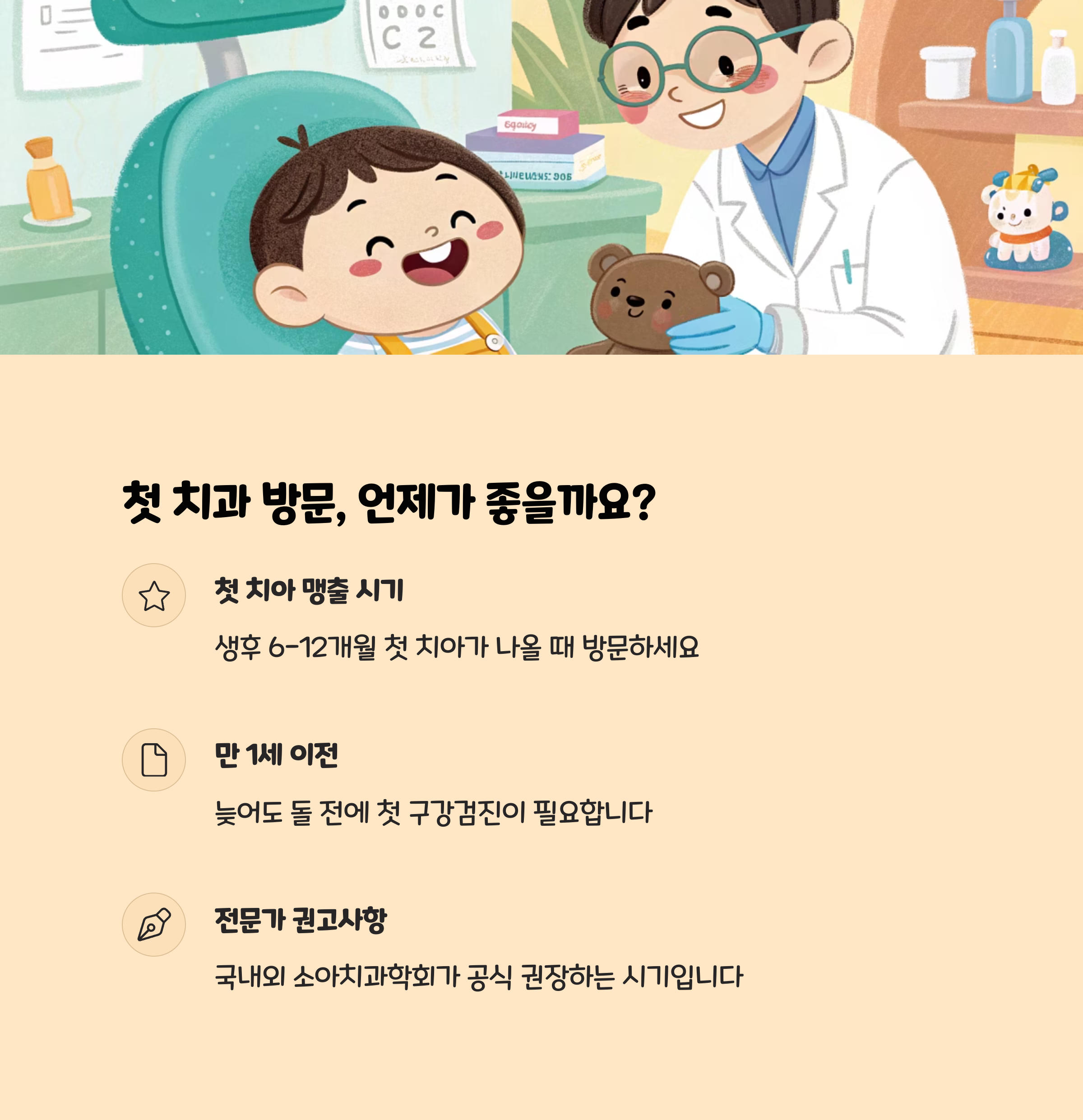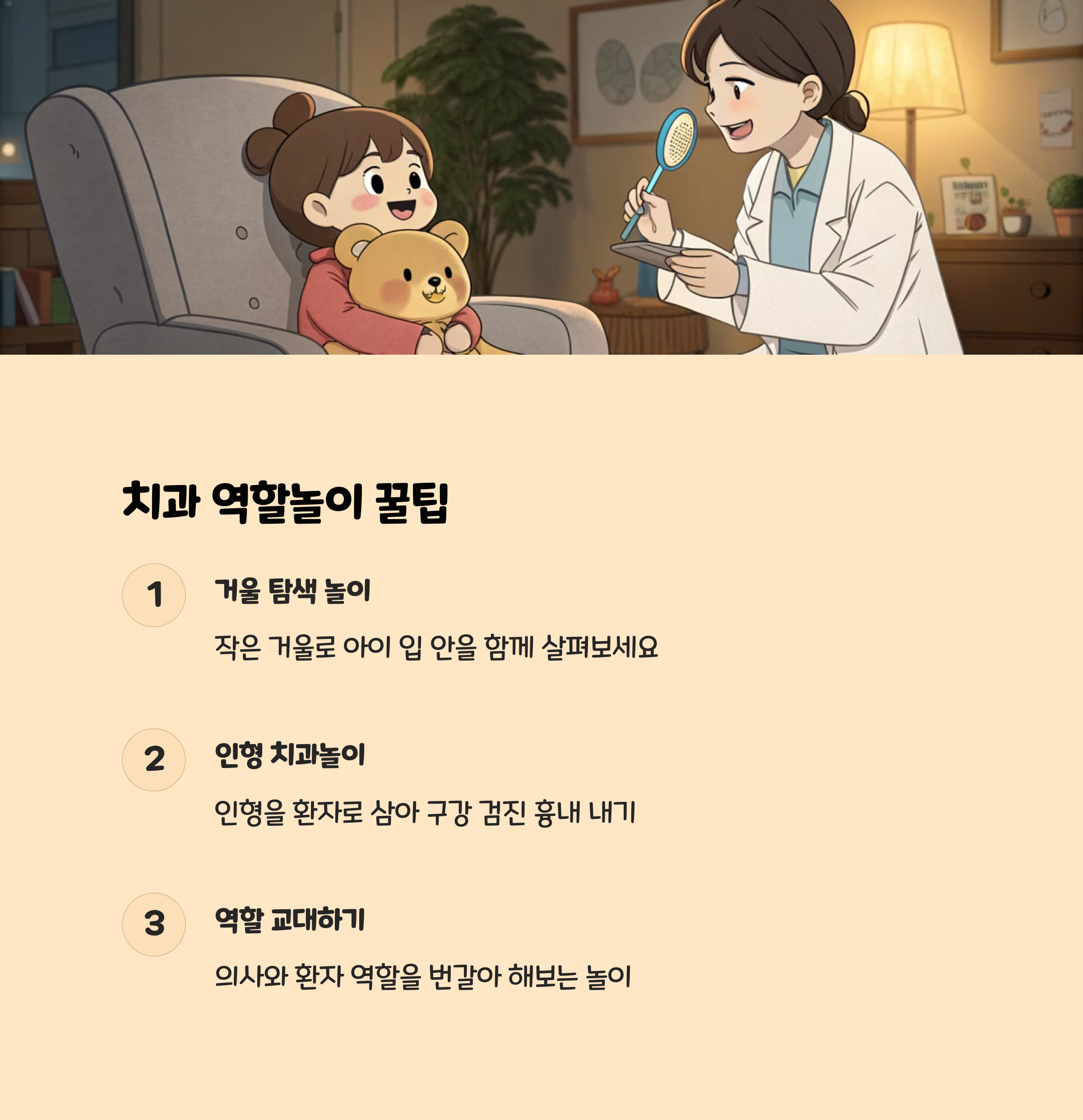 - 인형이나 장난감을 이용해 “입을 크게 벌려볼까?” “치과 선생님이 이를 살펴볼 거야”와 같은 상황극을 반복하면, 아이는 실제 진료실 환경에 덜 낯설어합니다.