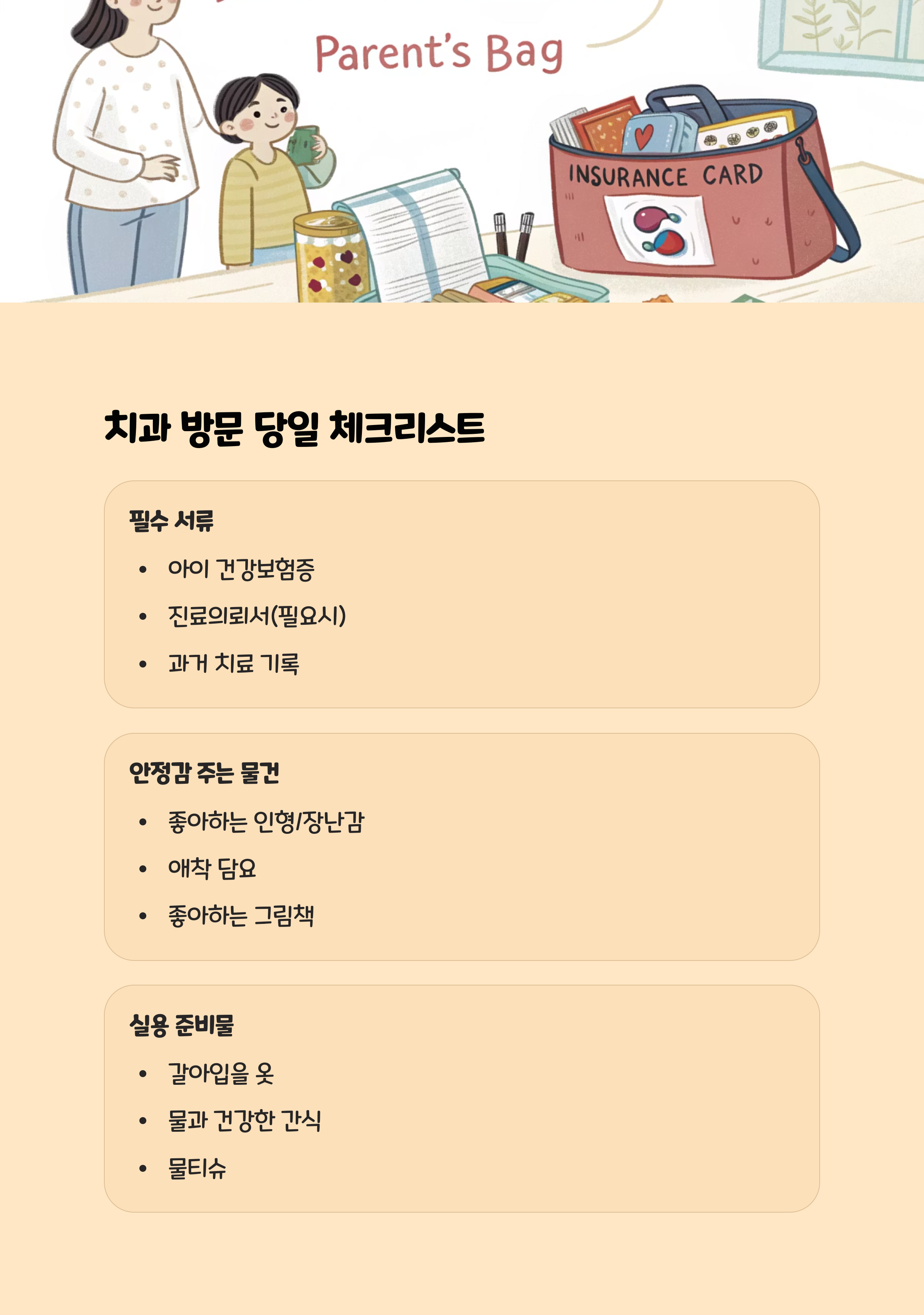 - 아이의 좋아하는 장난감이나 책 : 대기 시간과 진료 중 긴장 완화에 도움