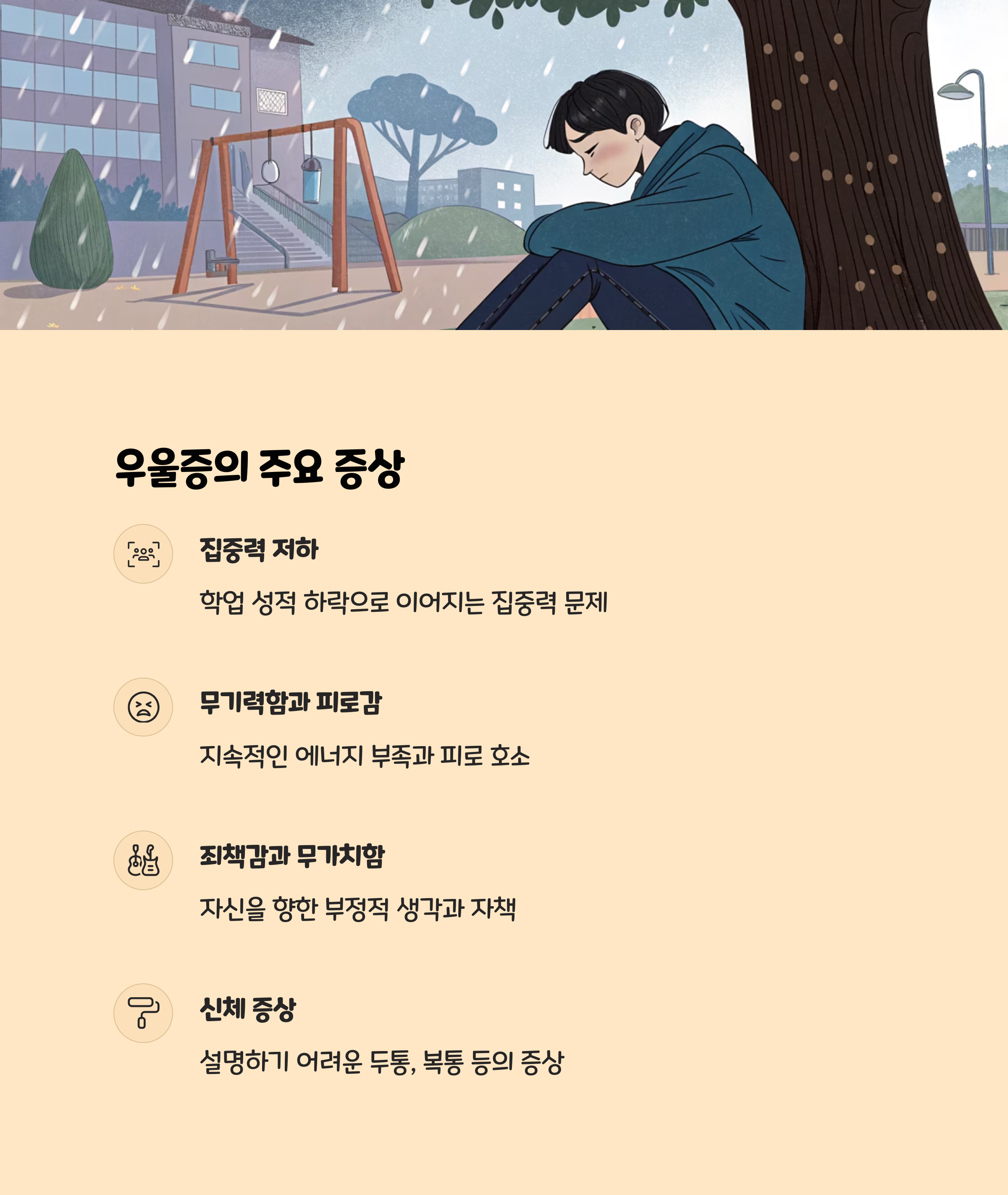 중학생의 우울증과 불안은 성인과 달리 직접적으로 “우울하다”고 표현하지 않는 경우가 많습니다. 대신 다음과 같은 신호에 주목해야 합니다.