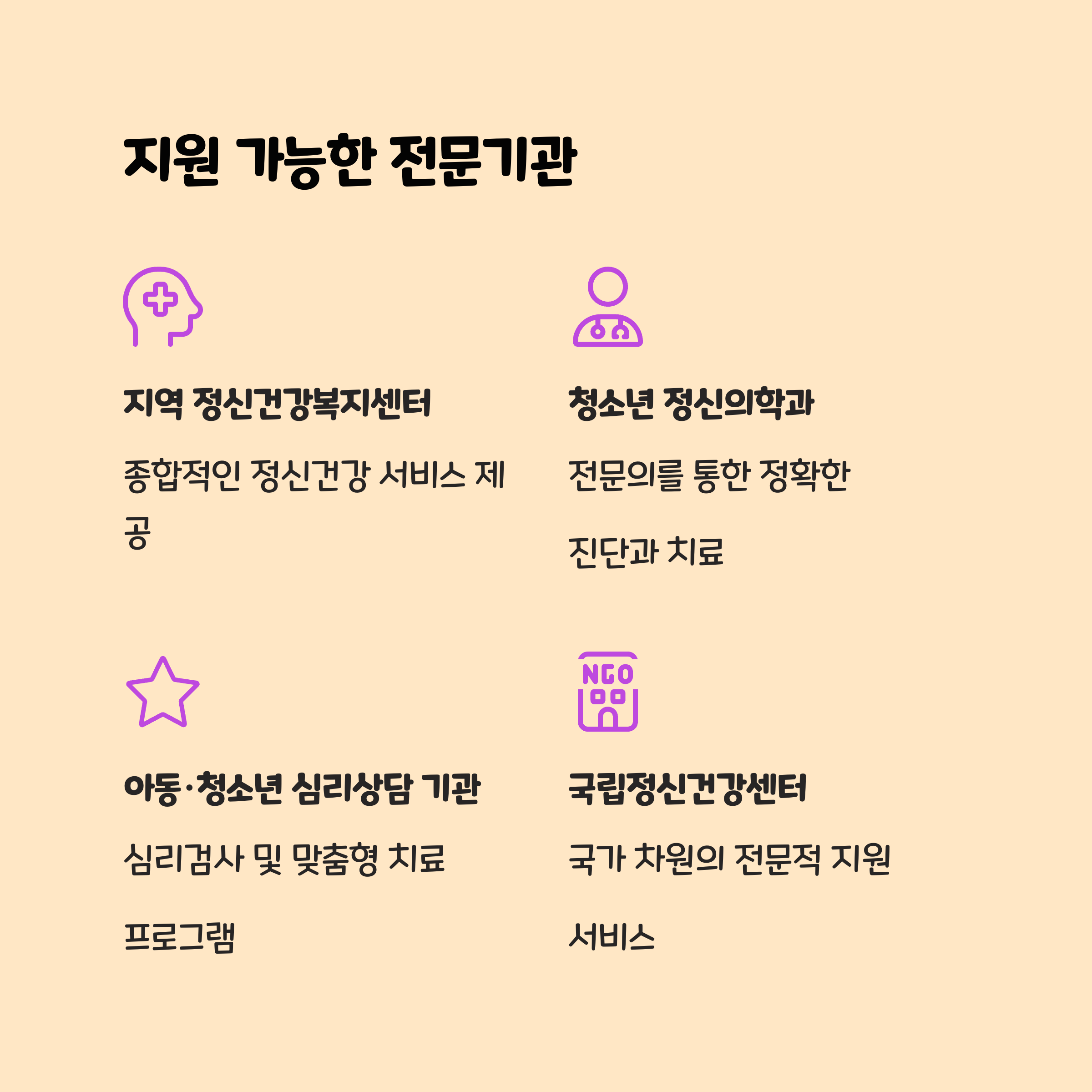 청소년상담복지센터, 정신건강복지센터 등에서 무료 또는 저렴한 비용으로 상담 서비스를 제공합니다. 각 지역별로 운영 중인 센터를 통해 전문 상담과 심리치료, 위기 지원을 받을 수 있습니다.