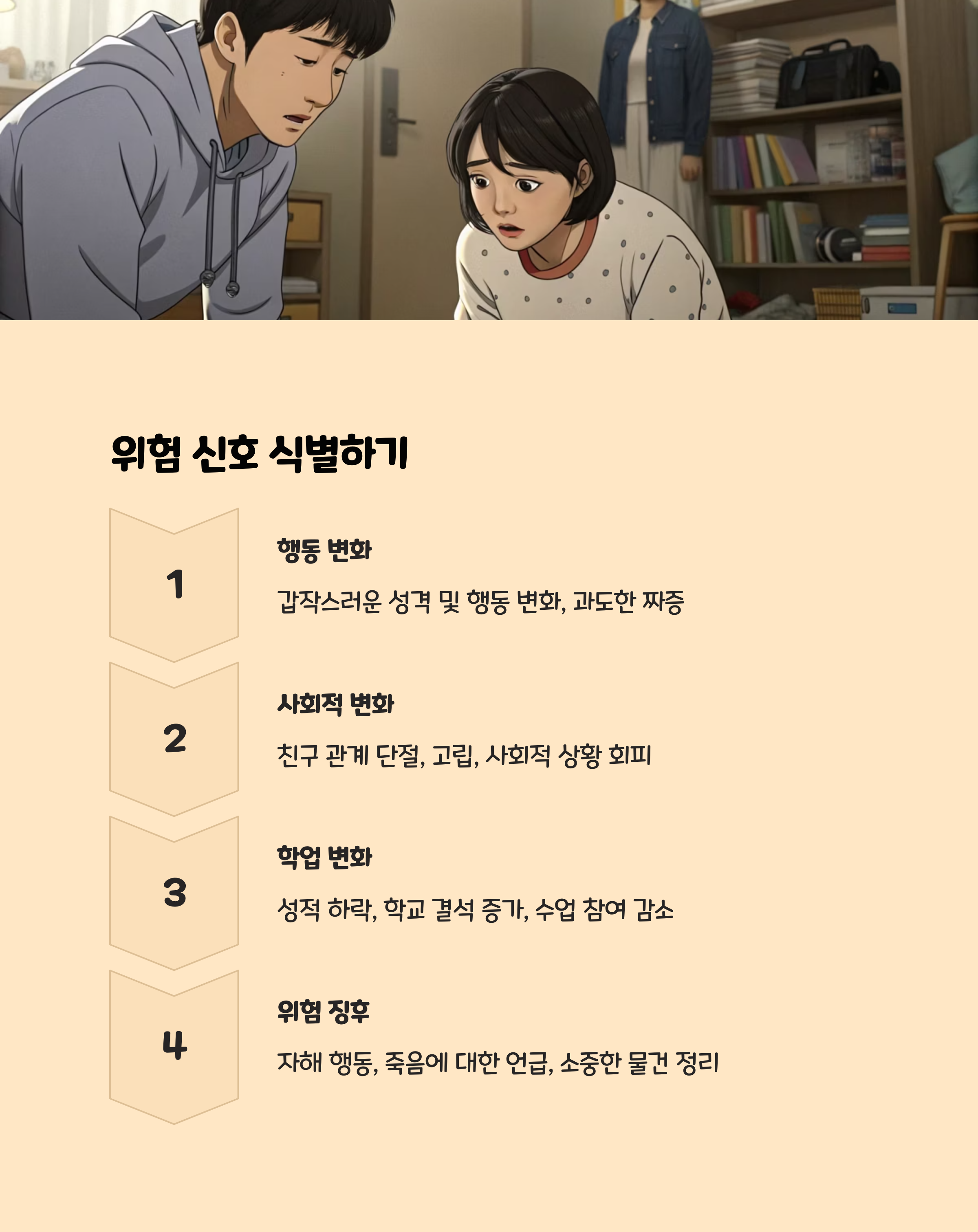 아이의 감정과 행동 변화를 주의 깊게 관찰하고, 비난이나 조언보다는 공감적으로 대화를 시도하세요. “요즘 힘든 일 있니?”처럼 마음을 열 수 있는 질문을 하고, 필요시 전문가 상담을 권유하세요.