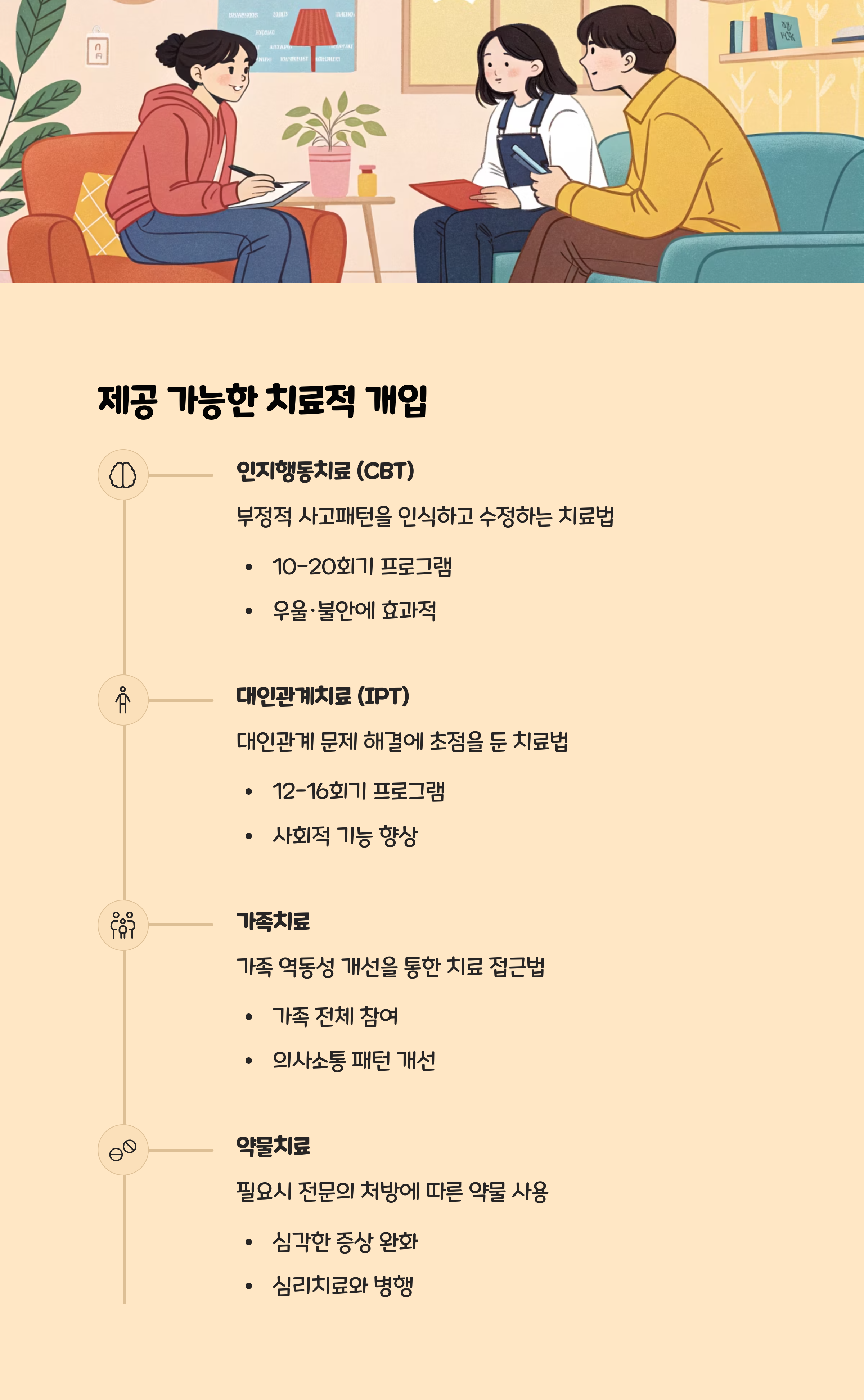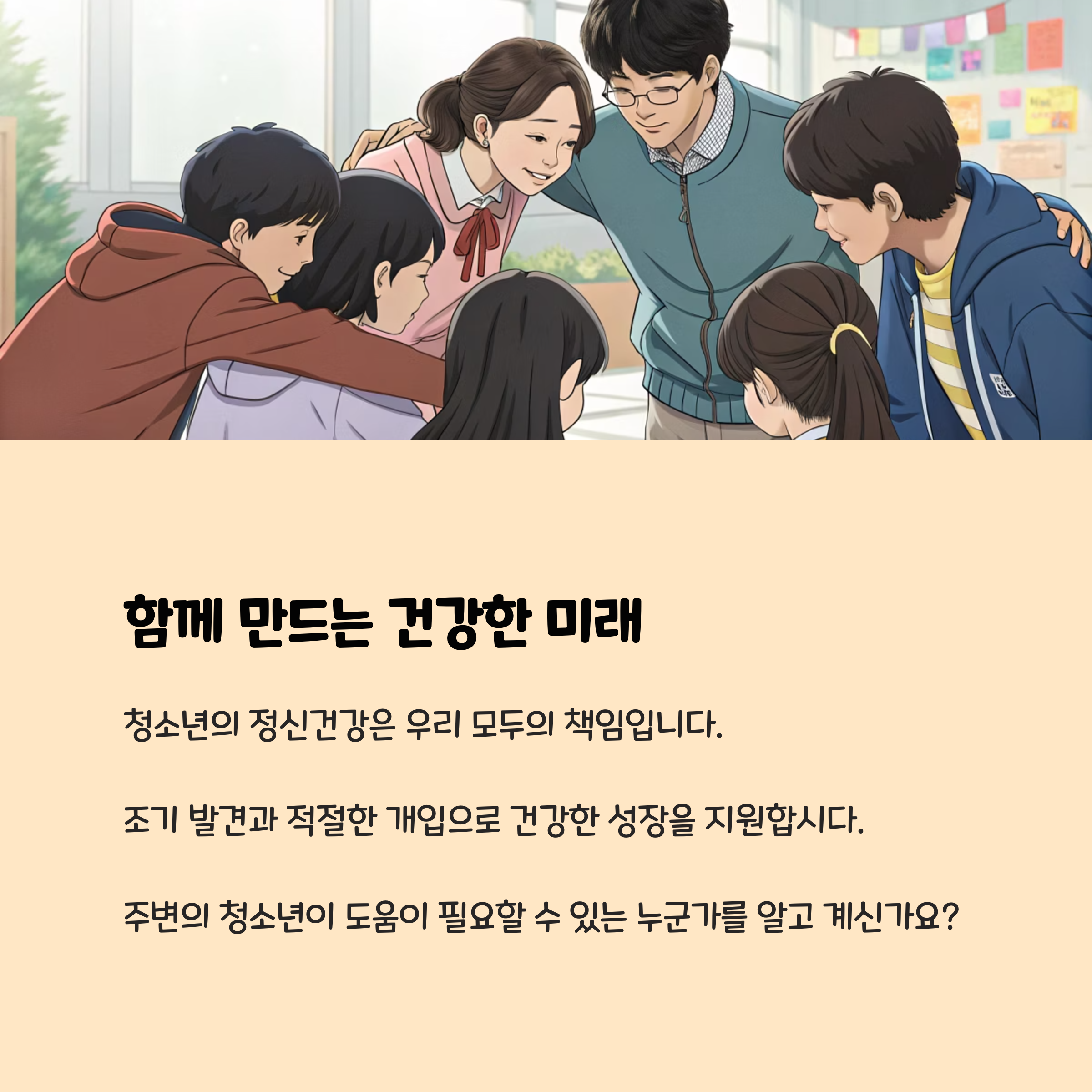 2025년부터 전국 초·중·고교에서는 정신건강 선별검사(SDQ, PHQ-9 등)를 실시해 고위험군 학생을 조기에 발견하고 있습니다. 선별검사에서 위험 신호가 포착되면 교내 상담실, 청소년상담복지센터 등으로 연계하여 심층 평가와 맞춤형 상담을 제공합니다.