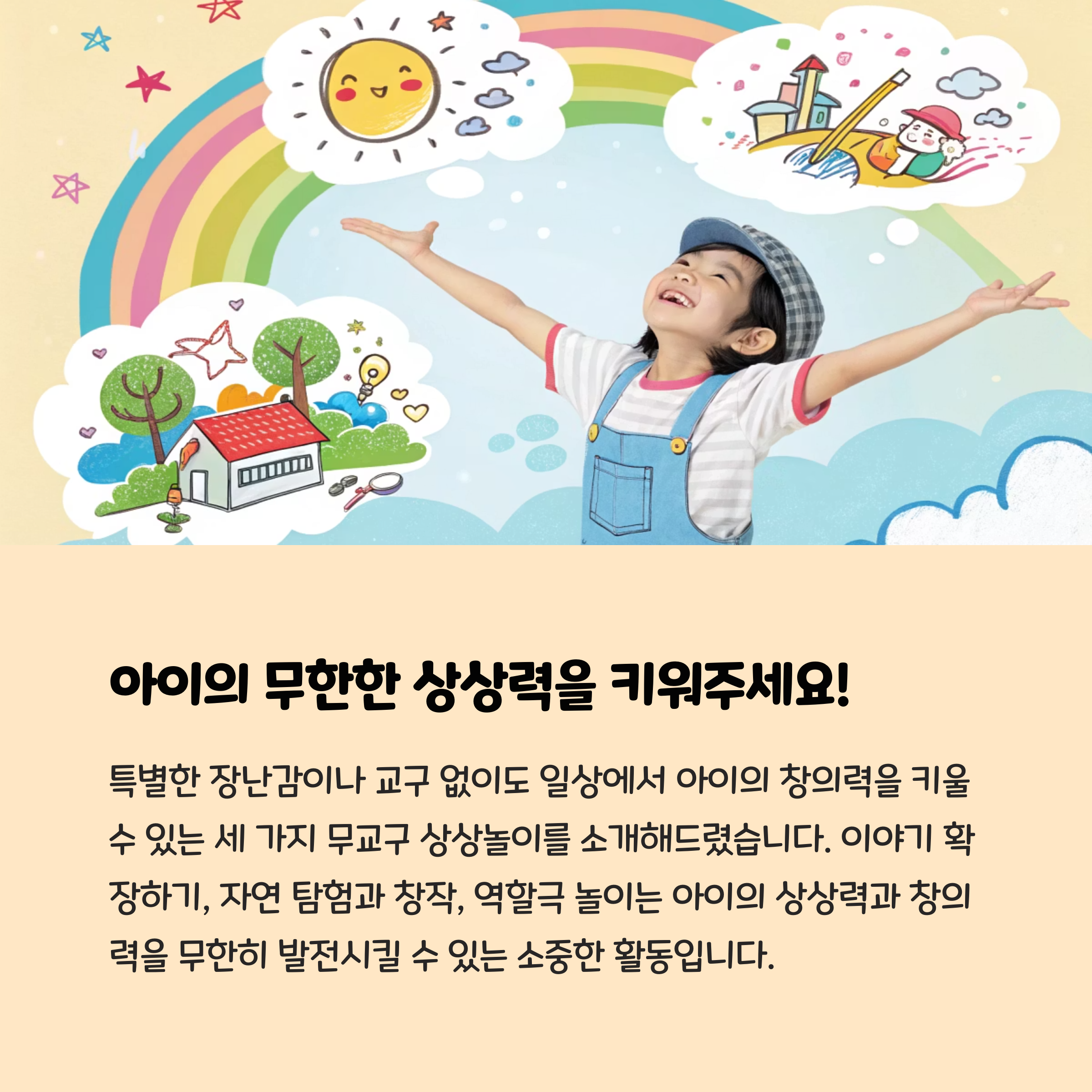 아이의 창의력을 키우는 방법에 대해 고민 중이라면, 일상에서 간단히 실천할 수 있는 창의적 놀이를 통해 아이의 상상력과 문제 해결 능력을 자극하는 것이 중요합니다. 이 글에서는 창의력을 자극하는 무교구 상상놀이 TOP 3을 소개하며, 이를 통해 아이가 자유롭게 사고하고 표현할 수 있는 환경을 만들어보세요.