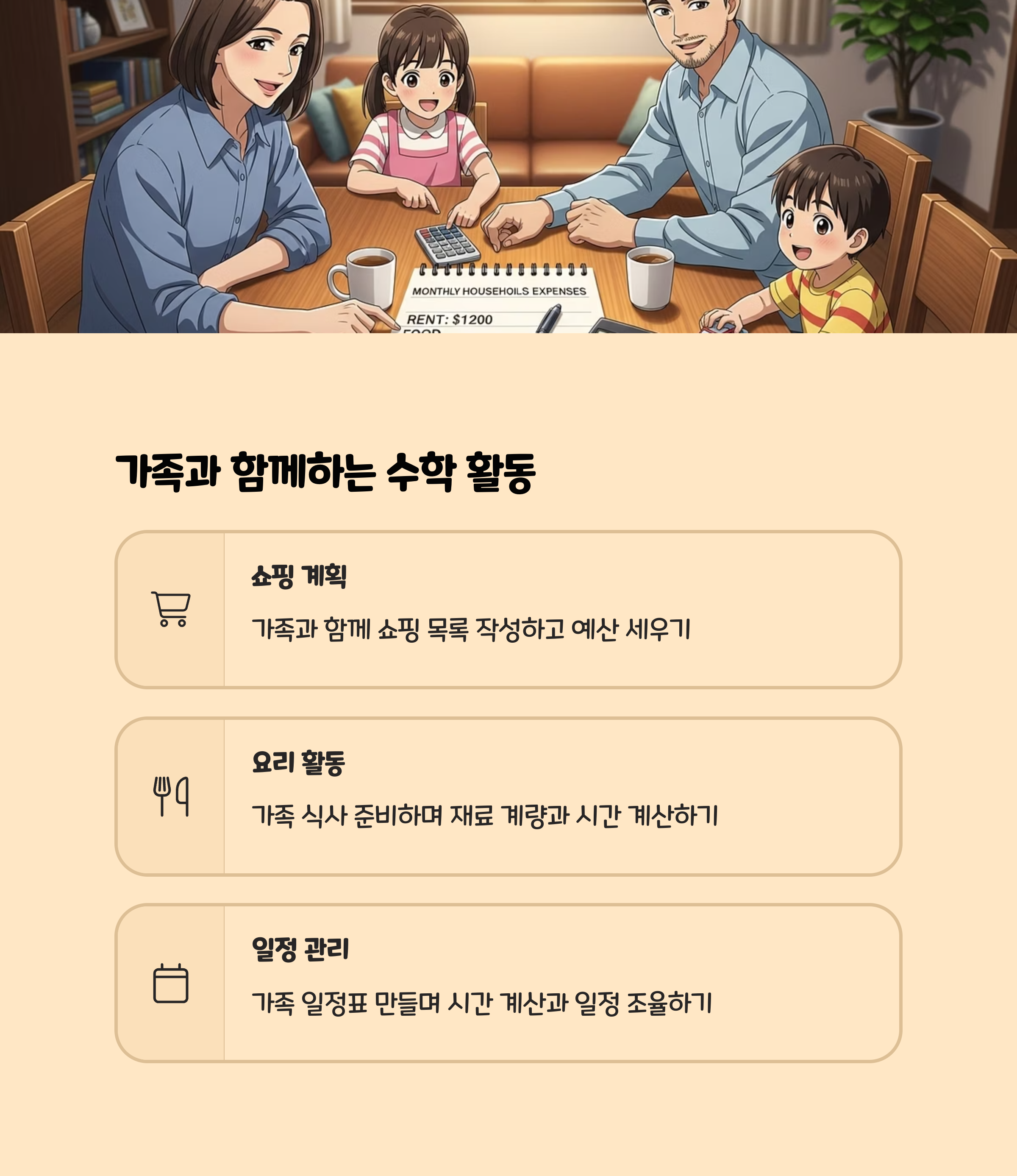 - 가족과 함께 쇼핑, 요리 등 다양한 활동에 수학을 접목해 보세요.